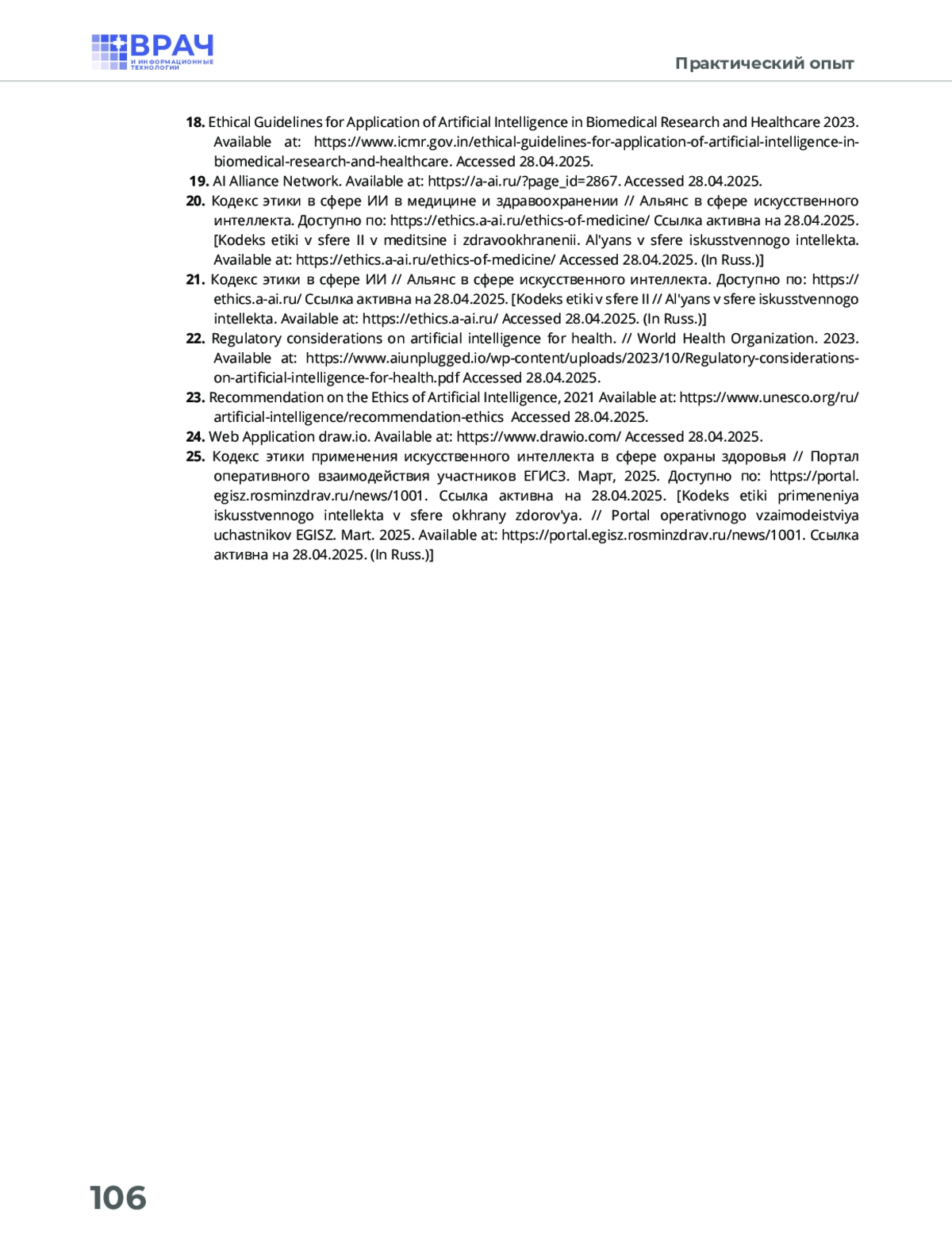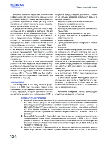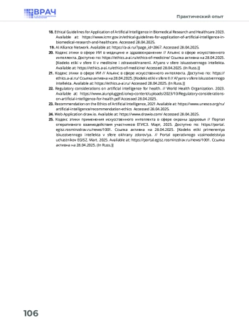 25. Кодекс этики применения искусственного интеллекта в сфере охраны здоровья // Портал оперативного взаимодействия участников ЕГИСЗ. Март, 2025. Доступно по: https://portal.egisz.rosminzdrav.ru/news/1001. Ссылка активна на 28. 04. 2025.