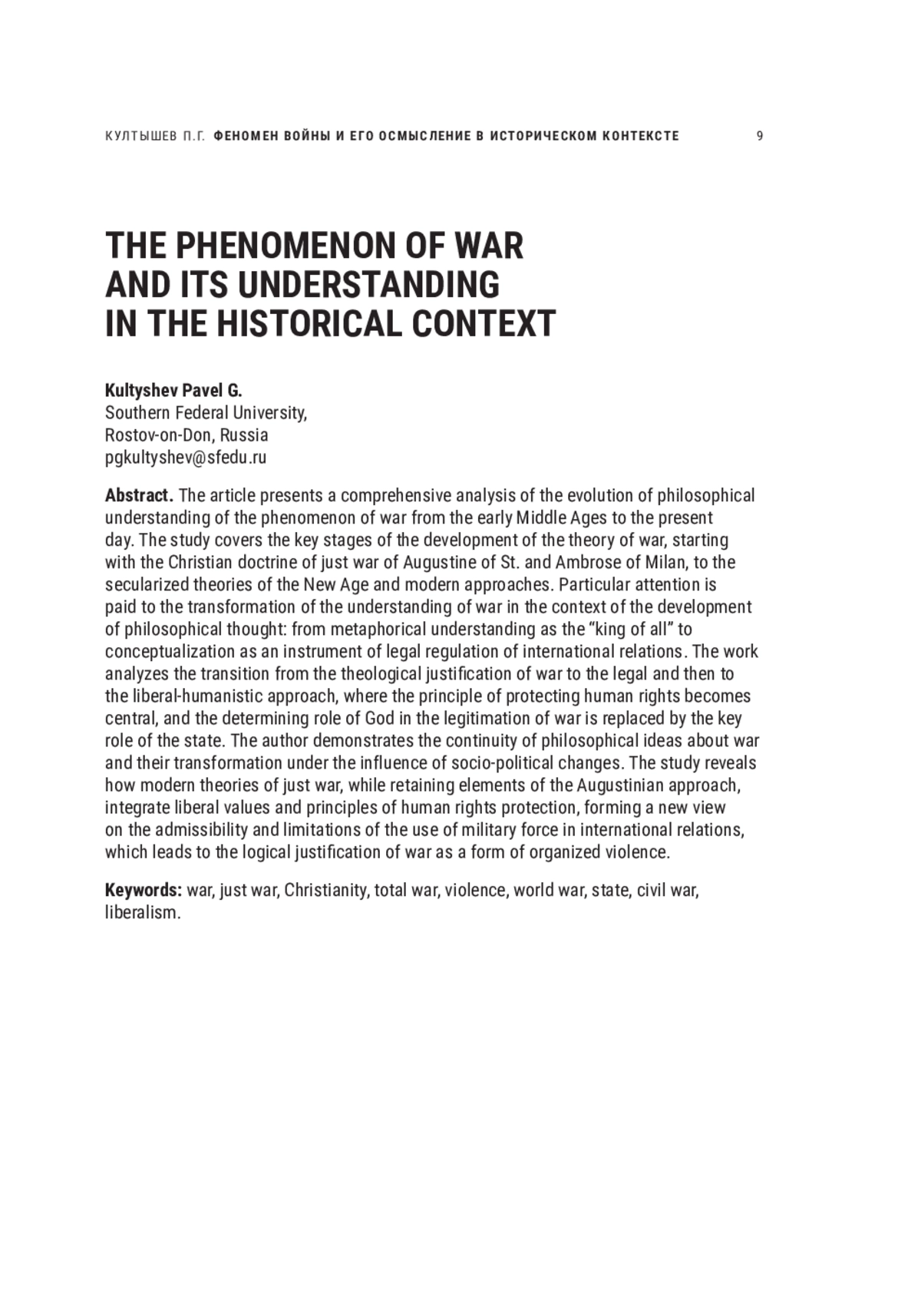 В статье представлен комплексный анализ эволюции философского осмысления феномена войны от раннего Средневековья до современности. Исследование охватывает ключевые этапы развития теории войны: от христианской доктрины справедливой войны Августина Блаженного и Амвросия Медиоланского до секуляризированных теорий Нового времени и современных подходов. Особое внимание уделяется трансформации понимания войны в контексте развития философской мысли: от метафорического осмысления как «царя всего» до концептуализации как инструмента правового регулирования международных отношений. В работе анализируется переход от теологического обоснования войны к правовому и затем к либерально-гуманистическому подходу, где центральным становится принцип защиты прав человека, а определяющая роль Бога в легитимации войны подменяется ключевой ролью государства. Автор демонстрирует преемственность философских идей о войне и их трансформацию под влиянием социально-политических изменений. Исследование выявляет, как современные теории справедливой войны, сохраняя элементы августиновского подхода, интегрируют либеральные ценности и принципы защиты прав человека, формируя новый взгляд на допустимость и ограничения применения военной силы в международных отношениях, что приводит к закономерному оправданию войны как формы организованного насилия