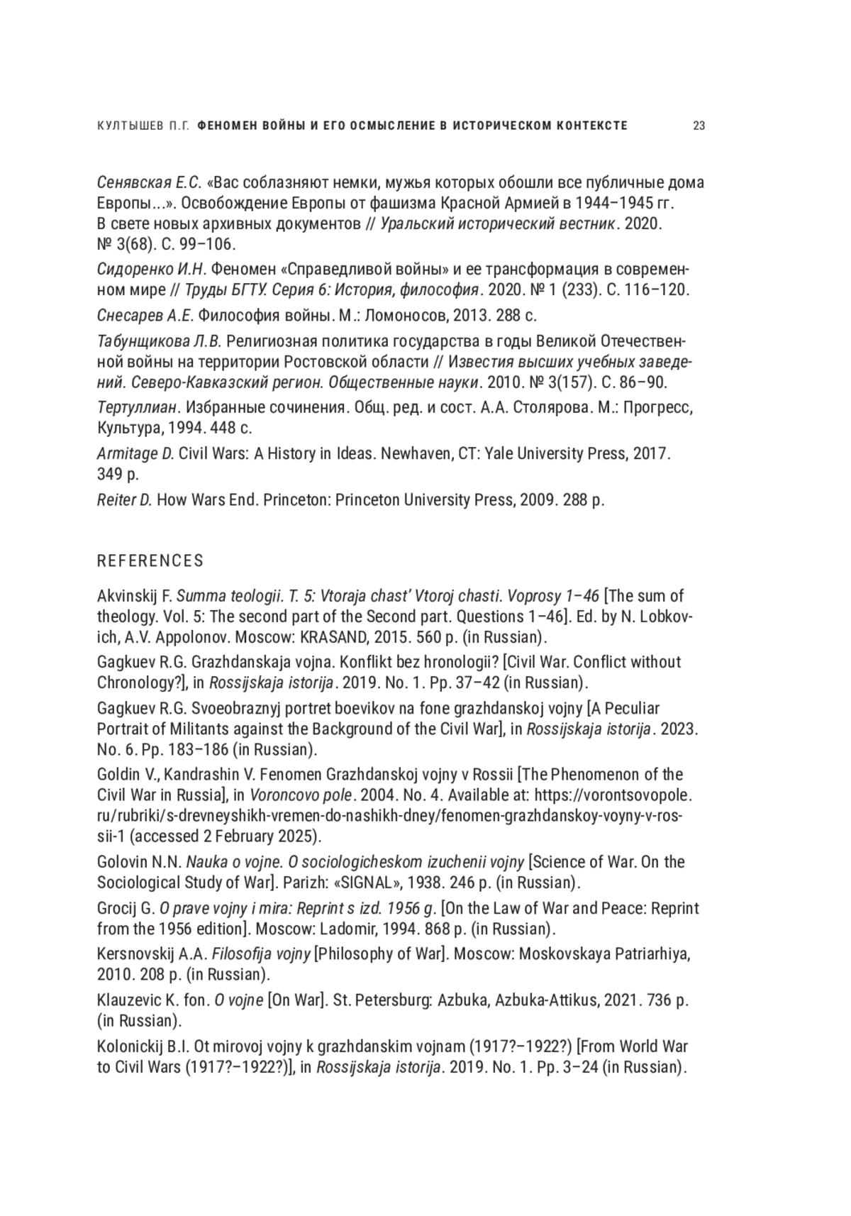 37. Sidorenko I.N. Fenomen “Spravedlivoi voiny” i ee transformatsiya v sovremennom mire [The Phenomenon of the “Just War” and its Transformation in the Modern World], in Trudy BGTU. Seriya 6: Istoriya, filosofiya. 2020. No. 1 (233). Pp. 116-120 (in Russian).