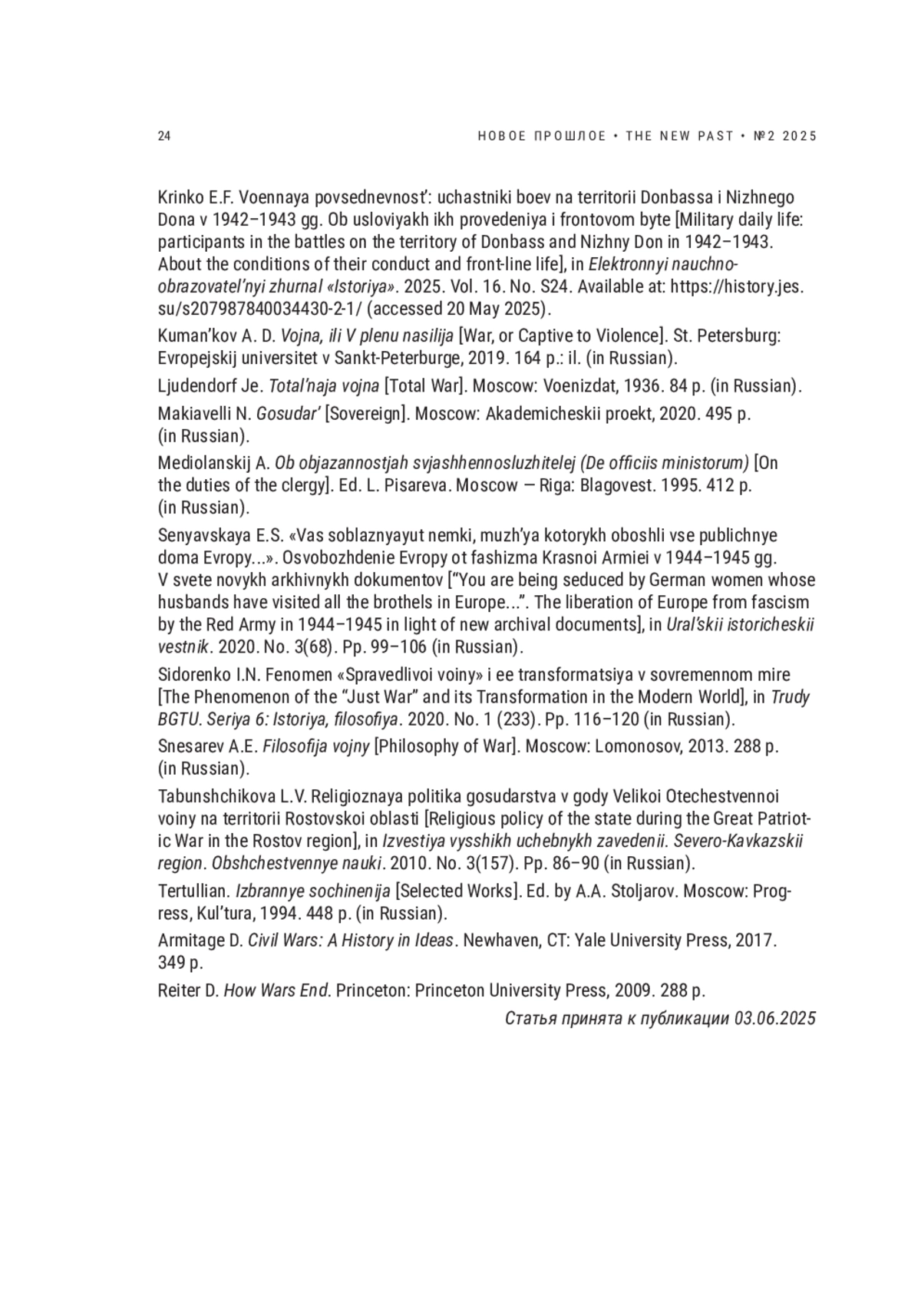 31. Krinko E.F. Voennaya povsednevnost’: uchastniki boev na territorii Donbassa i Nizhnego Dona v 1942-1943 gg. Ob usloviyakh ikh provedeniya i frontovom byte [Military daily life: participants in the battles on the territory of Donbass and Nizhny Don in 1942-1943. About the conditions of their conduct and front-line life], in Elektronnyi nauchno-obrazovatel’nyi zhurnal “Istoriya”. 2025. Vol. 16. No. S24. Available at: https://history.jes.su/s207987840034430-2-1/ (accessed 20 May 2025).