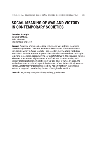 Статья посвящена философскому осмыслению роли войны в современных обществах. Автор анализирует различные формы завершения войны — от полной победы до замораживания конфликта — и поднимает вопрос о моральных и институциональных последствиях таких исходов. Особое внимание уделено идее победы как не только военного, но и нравственного явления, в том числе в контексте Второй мировой войны. Обсуждаются античные и религиозные ритуалы очищения победителей от насилия, а также критически осмысляется современное восприятие войны как источника прогресса. В тексте также поднимается вопрос о политической ответственности в контексте войны. Рассматривается концепция политической ответственности Ханны Арендт, в ответ на которую автор предлагает альтернативный взгляд, апеллирующий к праву человека быть аполитичным