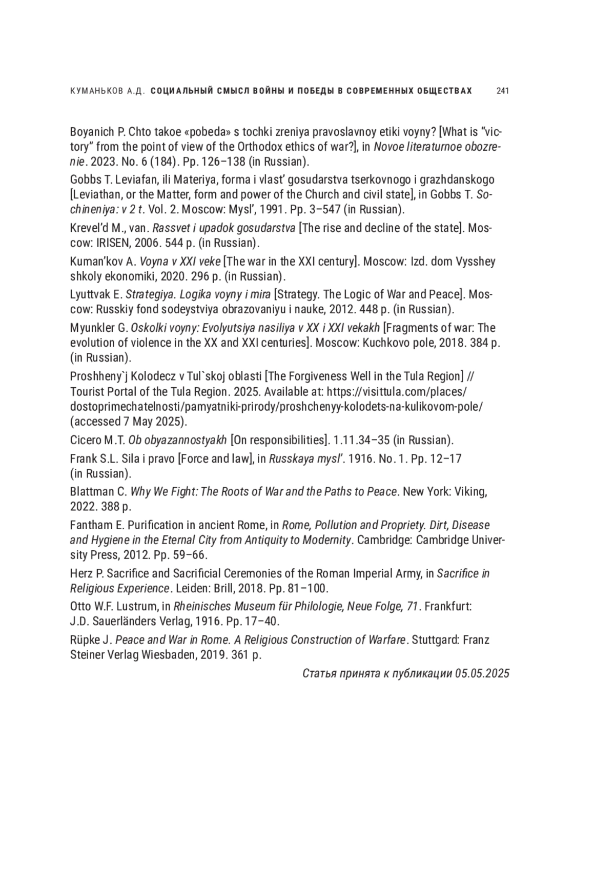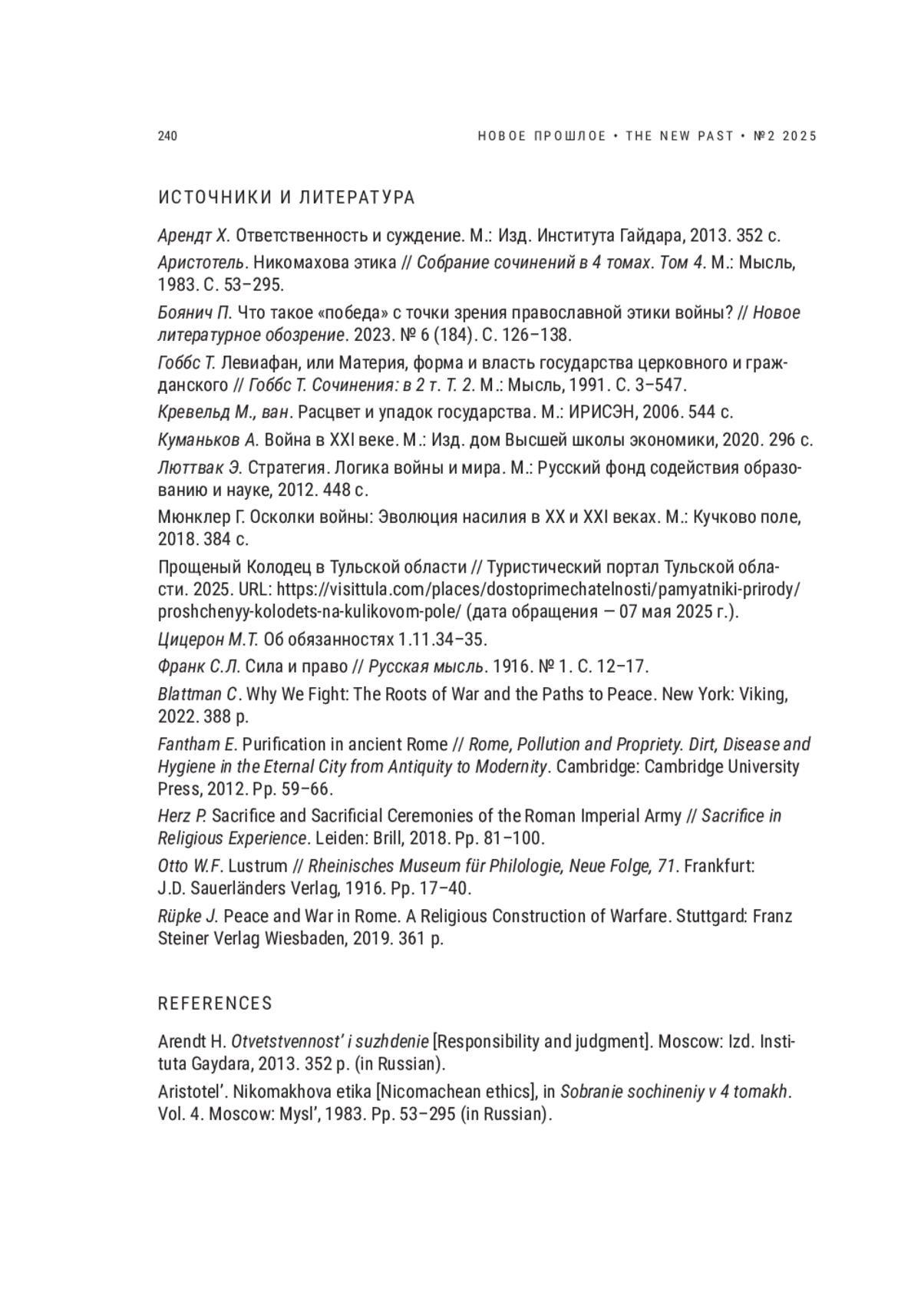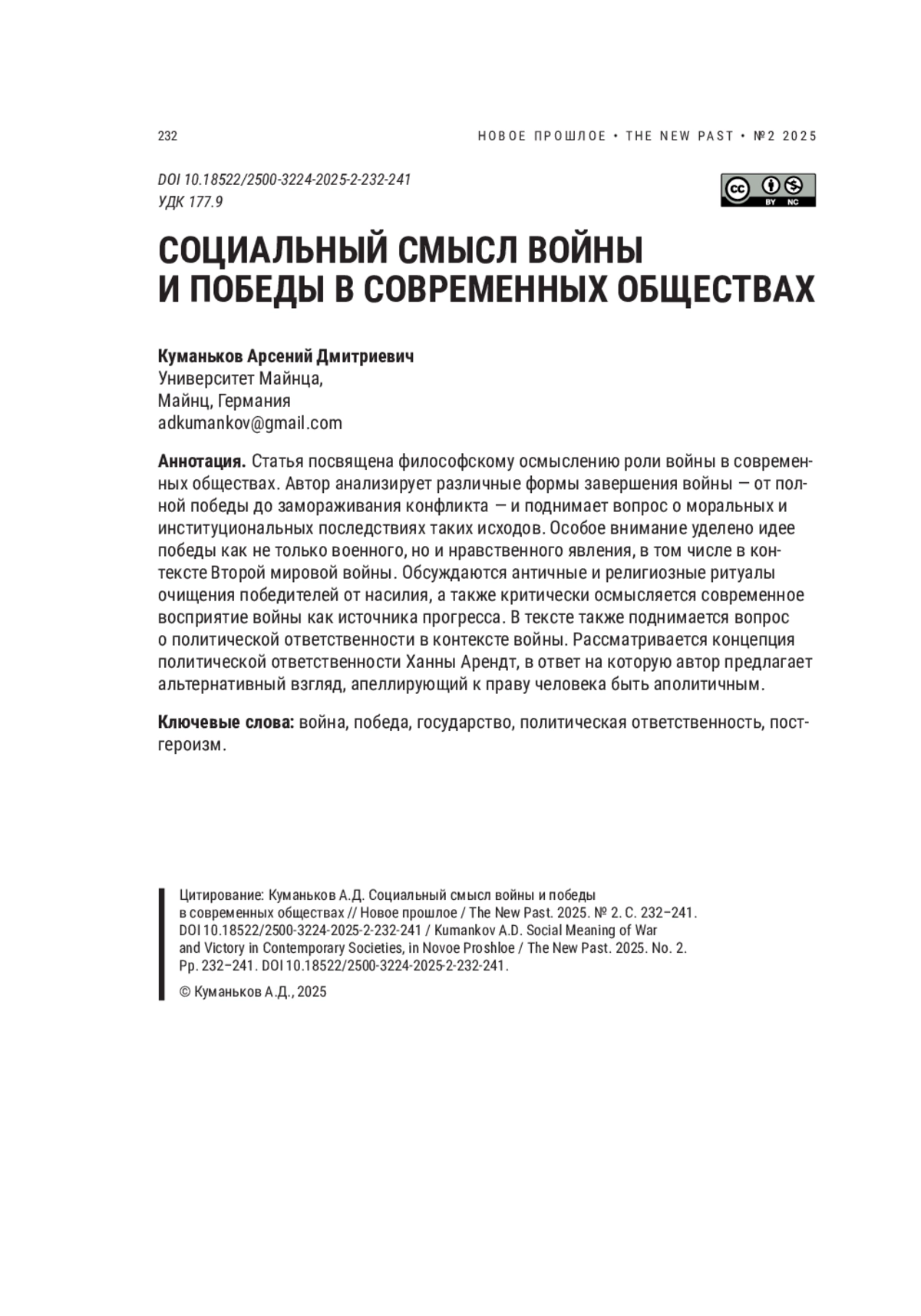 КУМАНЬКОВ А. Д. СОЦИАЛЬНЫЙ СМЫСЛ ВОЙНЫ И ПОБЕДЫ В СОВРЕМЕННЫХ ОБЩЕСТВАХ // НОВОЕ ПРОШЛОЕ. 2025. № 2