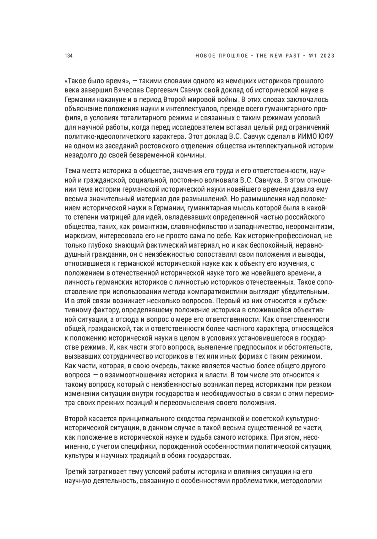 «Такое было время», — такими словами одного из немецких историков прошлого века завершил Вячеслав Сергеевич Савчук свой доклад об исторической науке в Германии накануне и в период Второй мировой войны. В этих словах заключалось объяснение положения науки и интеллектуалов, прежде всего гуманитарного профиля, в условиях тоталитарного режима и связанных с таким режимам условий для научной работы, когда перед исследователем вставал целый ряд ограничений политико-идеологического характера. Этот доклад В. С. Савчук сделал в ИИМО ЮФУ на одном из заседаний ростовского отделения общества интеллектуальной истории незадолго до своей безвременной кончины