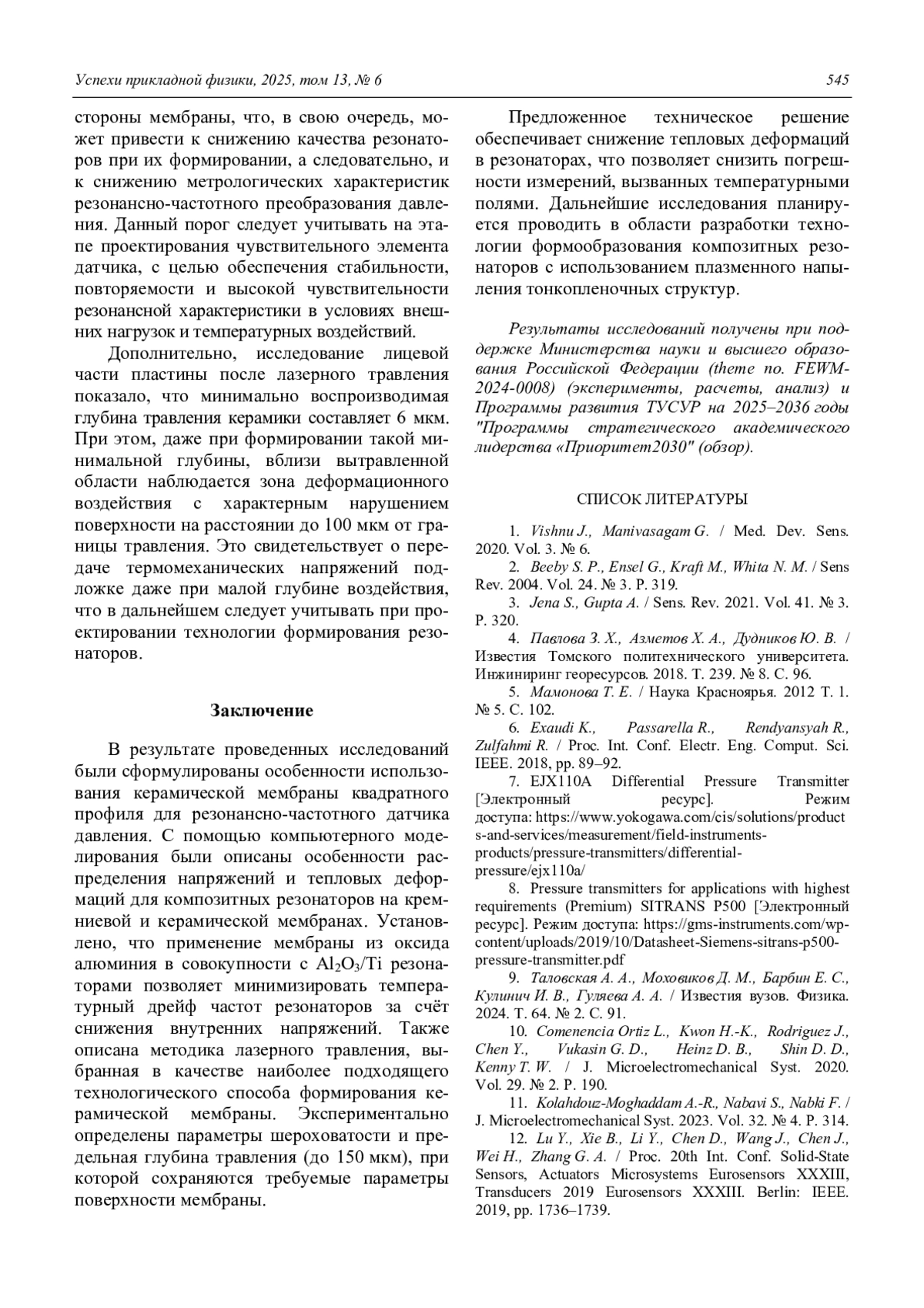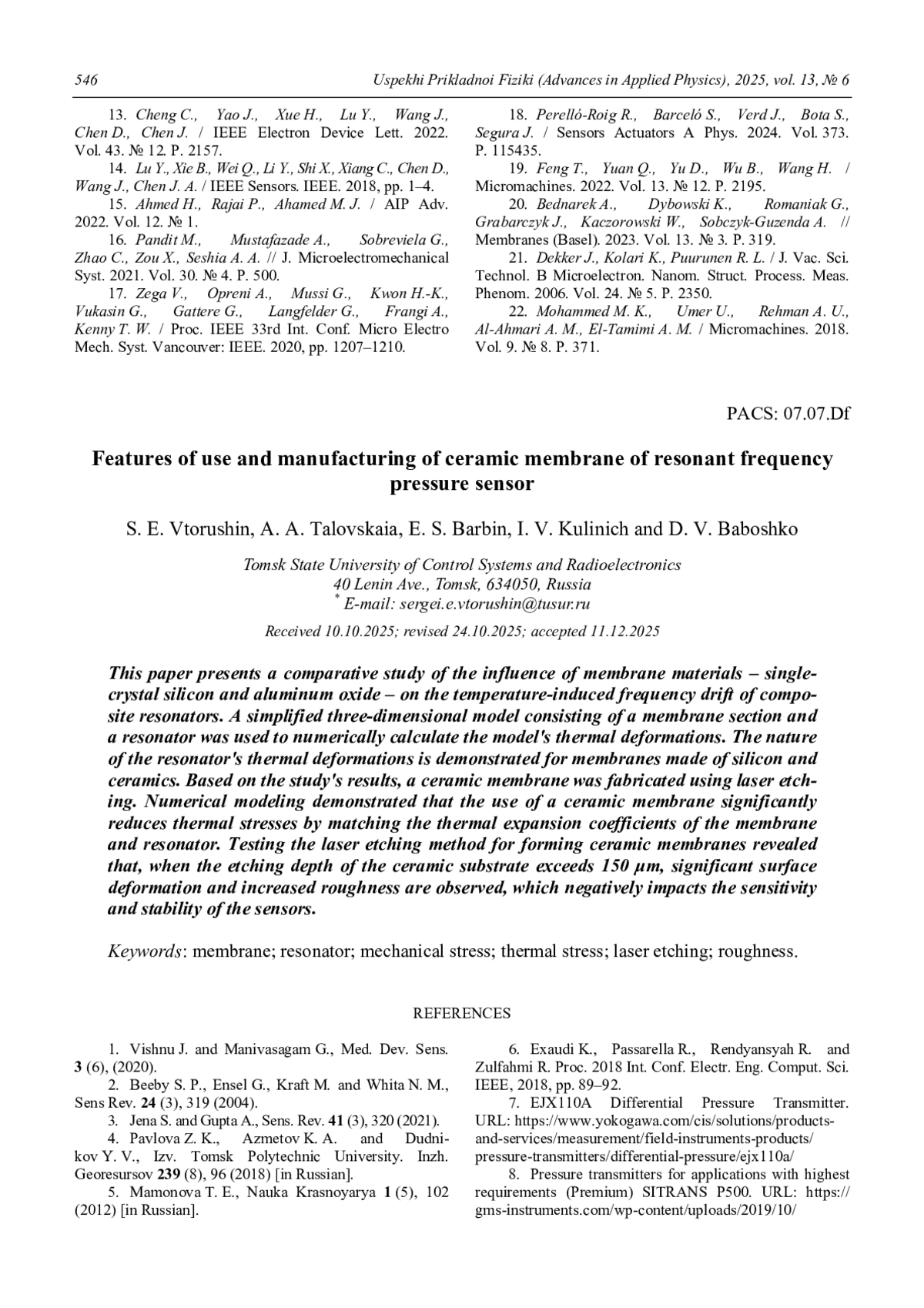 ВТОРУШИН С. Е., ТАЛОВСКАЯ А. А., БАРБИН Е. С., КУЛИНИЧ И. В., БАБОШКО Д. В. ИССЛЕДОВАНИЯ КЕРАМИЧЕСКОЙ МЕМБРАНЫ РЕЗОНАНСНО-ЧАСТОТНОГО ДАТЧИКА ДАВЛЕНИЯ // УСПЕХИ ПРИКЛАДНОЙ ФИЗИКИ. 2025. ТОМ 13, №6