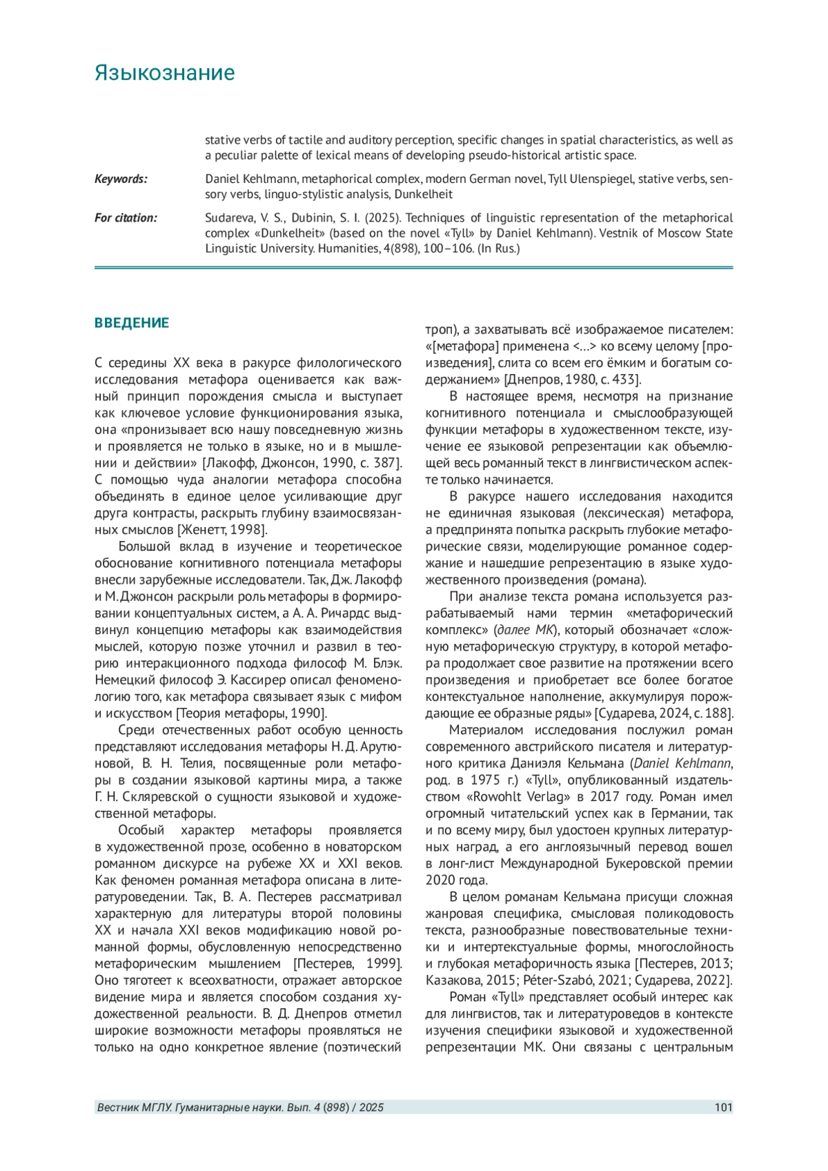 10. Сударева В. С. Своеобразие романной метафоры (на материале произведений Д. Кельмана) // Эволюция и трансформация дискурсов: языковые и социокультурные аспекты: сб. научн. ст. / отв. ред. С. И. Дубинин, В. Д. Шевченко. Самара: Самарский университет. 2022. Вып. 7. С. 174-181. EDN: EYSTIY