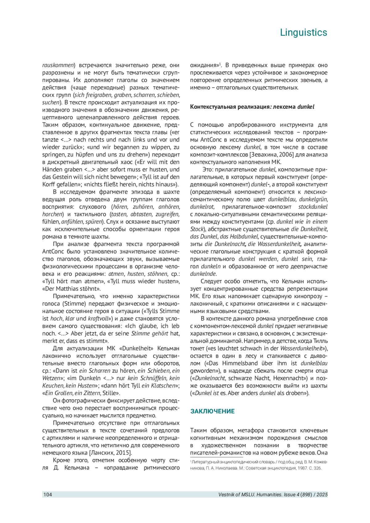В статье анализируется языковое наполнение метафорического комплекса «Dunkelheit» в современном немецкоязычном романном дискурсе. Исходной теоретической посылкой стало признание ключевой роли метафоры как когнитивного механизма смыслопорождения в художественной прозе рубежа XXI в. Исследование выполнено на основе лингвостилистического анализа. Материалом исследования послужил роман австрийского писателя Даниэля Кельмана «Tyll» (2017). Было установлено, что языковая репрезентация метафорического комплекса в серии сюжетно связанных текстовых фрагментов романа осуществляется с помощью глаголов тактильного и слухового восприятия, качественного изменения пространственных характеристик, а также своеобразной палитры лексических средств конструирования псевдоисторического пространства.