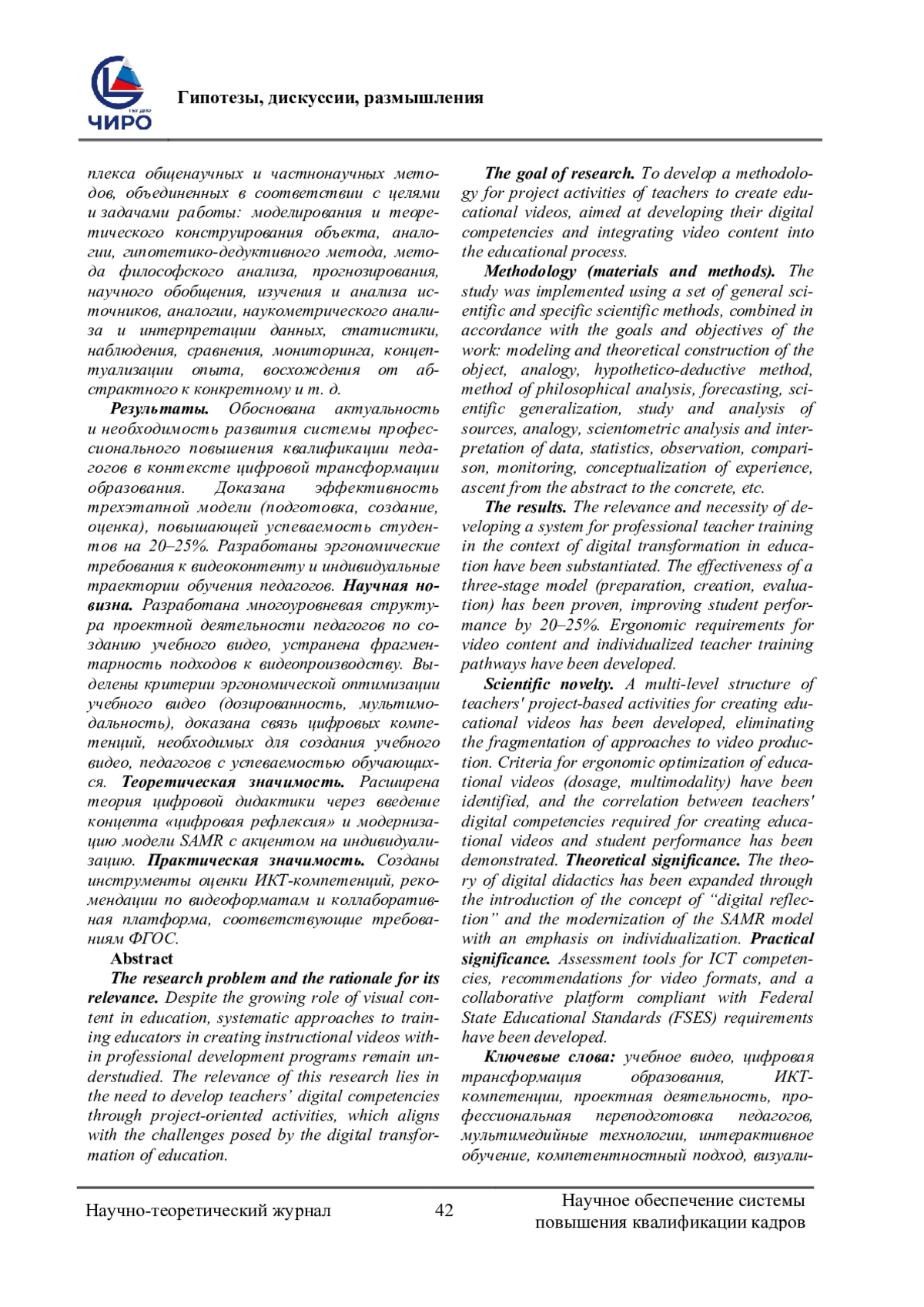 Проблема исследования и обоснование ее актуальности. Несмотря на растущую роль визуального контента в образовании, недостаточно изучены системные подходы к подготовке педагогов в области создания учебного видео в рамках программ профессиональной переподготовки. Актуальность исследования обусловлена необходимостью формирования цифровых компетенций педагогов через проектно ориентированную деятельность, что соответствует вызовам цифровой трансформации образования. Цель исследования. Разработать методику организации проектной деятельности педагогов по созданию учебного видео, направленную на формирование их цифровых компетенций и интеграцию видеоконтента в образовательный процесс. Методология (материалы и методы). Исследование реализовано с применением комплекса общенаучных и частнонаучных методов, объединенных в соответствии с целями и задачами работы: моделирования и теоретического конструирования объекта, аналогии, гипотетико-дедуктивного метода, метода философского анализа, прогнозирования, научного обобщения, изучения и анализа источников, аналогии, наукометрического анализа и интерпретации данных, статистики, наблюдения, сравнения, мониторинга, концептуализации опыта, восхождения от абстрактного к конкретному и т. д. Результаты. Обоснована актуальность и необходимость развития системы профессионального повышения квалификации педагогов в контексте цифровой трансформации образования. Доказана эффективность трехэтапной модели (подготовка, создание, оценка), повышающей успеваемость студентов на 20-25%. Разработаны эргономические требования к видеоконтенту и индивидуальные траектории обучения педагогов. Научная новизна. Разработана многоуровневая структура проектной деятельности педагогов по созданию учебного видео, устранена фрагментарность подходов к видеопроизводству. Выделены критерии эргономической оптимизации учебного видео (дозированность, мультимодальность), доказана связь цифровых компетенций, необходимых для создания учебного видео, педагогов с успеваемостью обучающихся. Теоретическая значимость. Расширена теория цифровой дидактики через введение концепта «цифровая рефлексия» и модернизацию модели SAMR с акцентом на индивидуализацию. Практическая значимость. Созданы инструменты оценки ИКТ-компетенций, рекомендации по видеоформатам и коллаборативная платформа, соответствующие требованиям ФГОС.