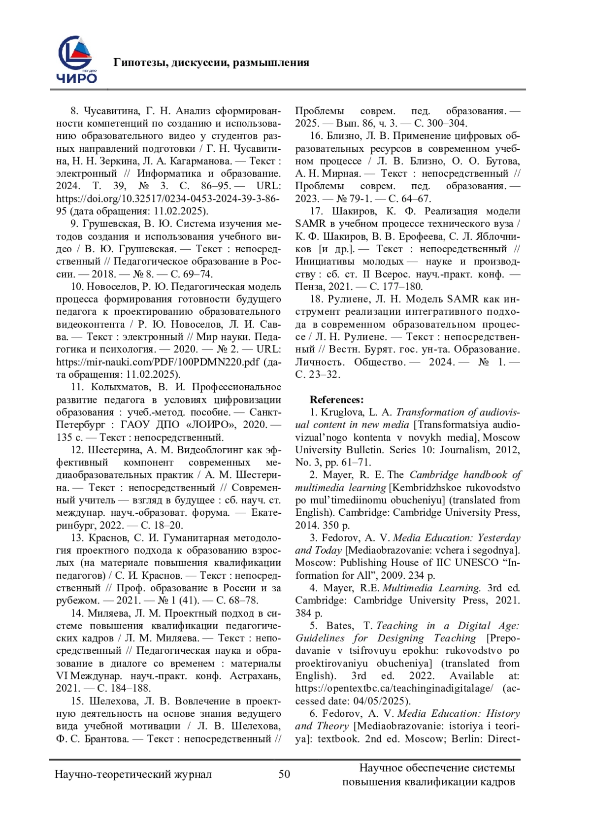 ШЕЛЕХОВА Л. В., ВЕРБИЧЕВА Е.А., ПОЛЯКОВА А.О. ПРОЕКТНАЯ ДЕЯТЕЛЬНОСТЬ В ПРОФЕССИОНАЛЬНОЙ ПЕРЕПОДГОТОВКЕ ПЕДАГОГОВ: СОЗДАНИЕ УЧЕБНОГО ВИДЕО КАК ИНСТРУМЕНТ ЦИФРОВОЙ ТРАНСФОРМАЦИИ ОБРАЗОВАНИЯ // НАУЧНОЕ ОБЕСПЕЧЕНИЕ СИСТЕМЫ ПОВЫШЕНИЯ КВАЛИФИКАЦИИ КАДРОВ. 2025. № 2 (63) (14 СТ.)