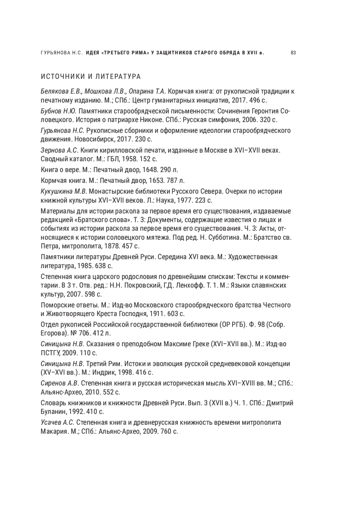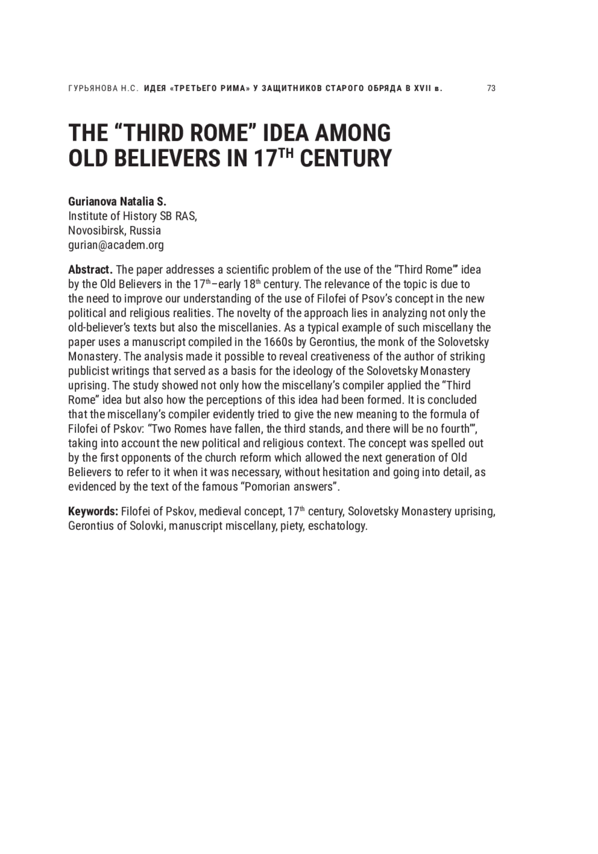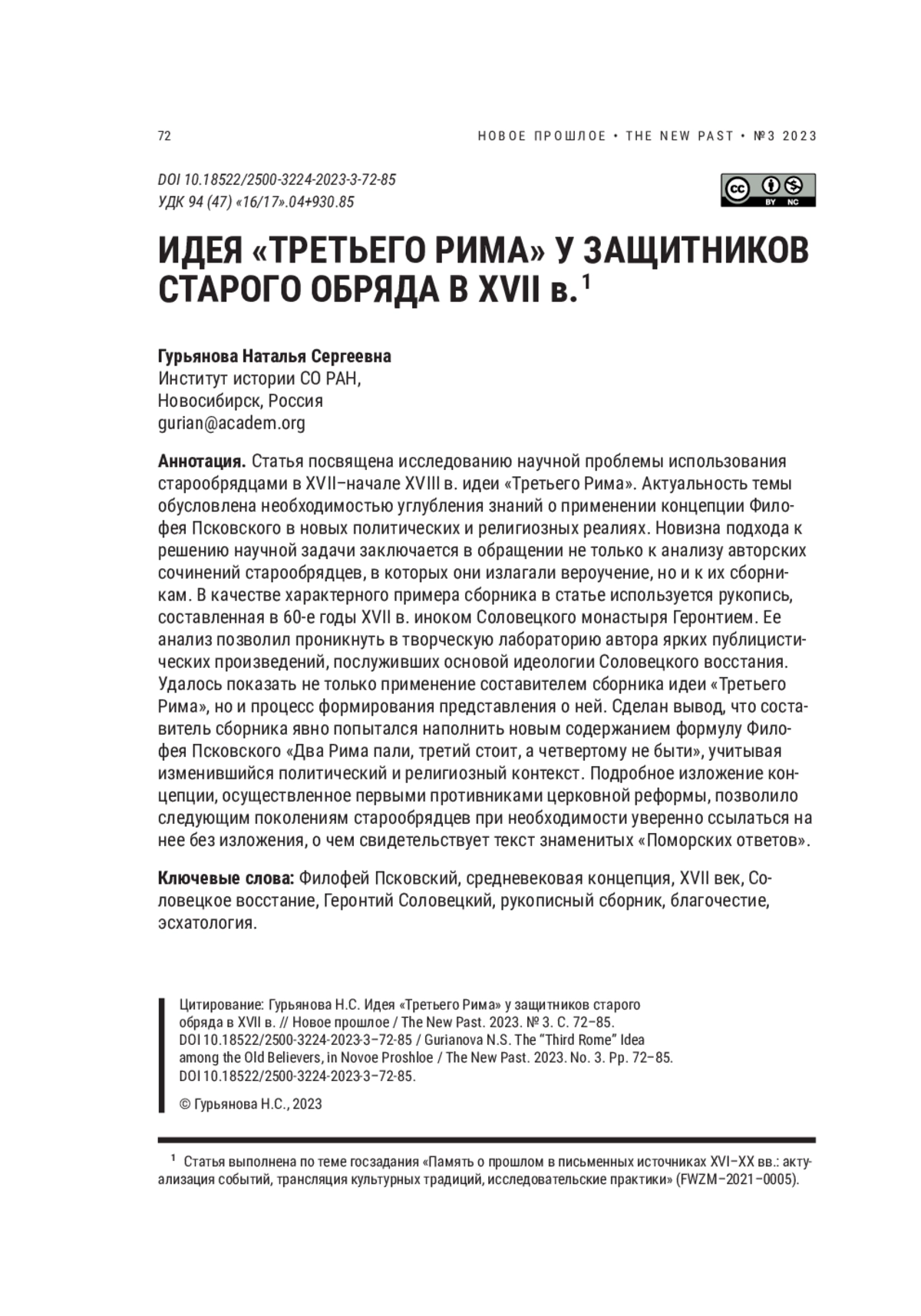 ГУРЬЯНОВА Н. С. ИДЕЯ "ТРЕТЬЕГО РИМА" У ЗАЩИТНИКОВ СТАРОГО ОБРЯДА В XVII В // НОВОЕ ПРОШЛОЕ. 2023. № 3