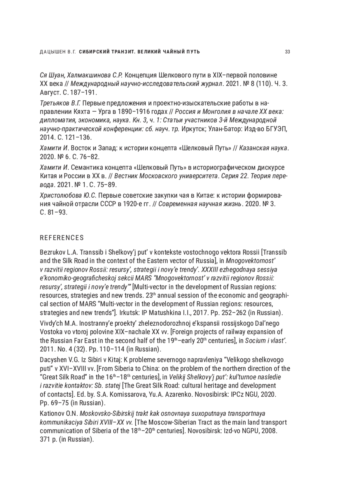 3. Дацышен В.Г. Из Сибири в Китай: к проблеме северного направления “Великого шелкового пути” в XVI-XVIII вв. // Великий Шелковый путь: культурное наследие и развитие контактов. Под ред. С.А. Комиссарова, Ю.А. Азаренко. Новосибирск: ИПЦ НГУ, 2020. С. 69-75.