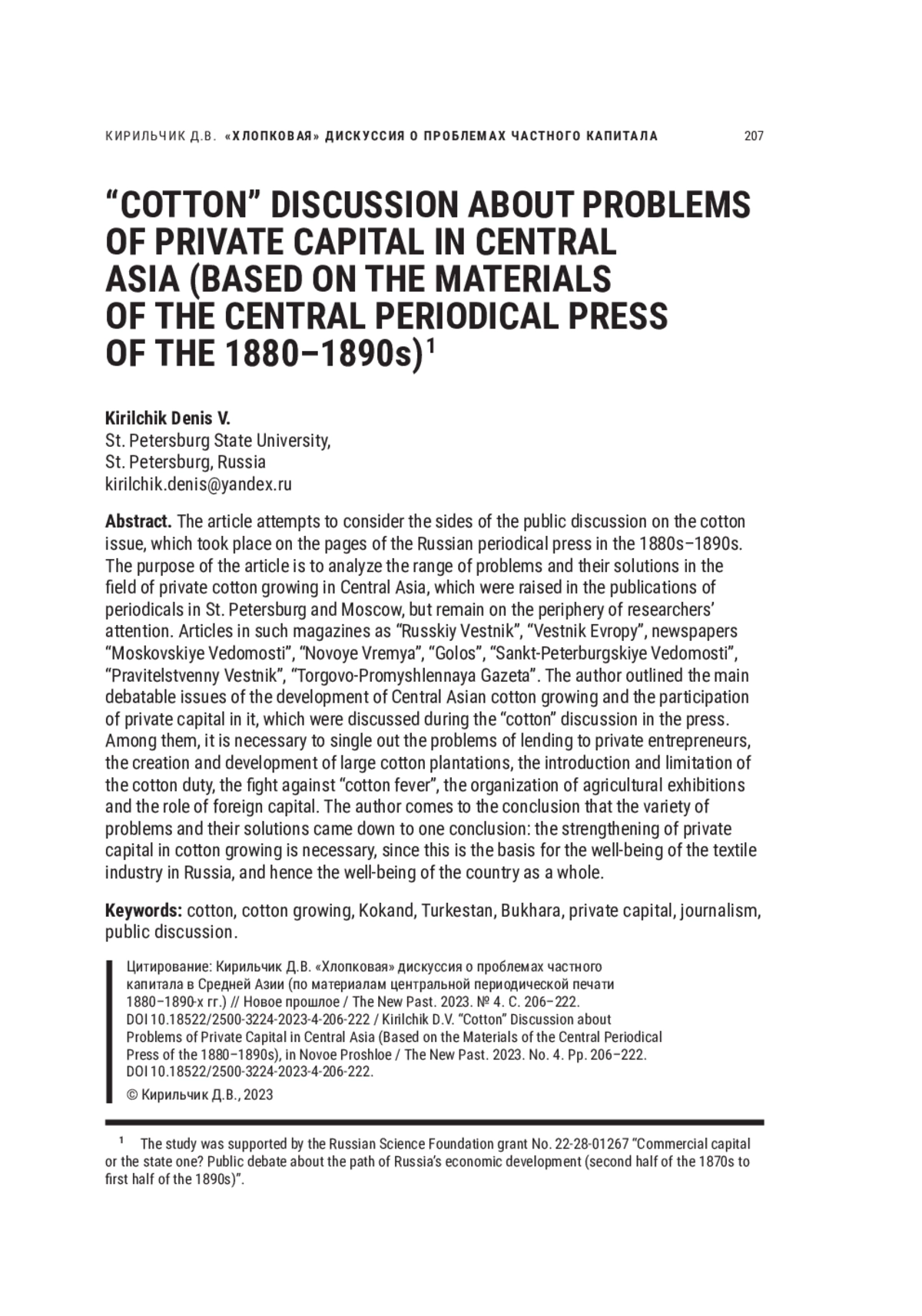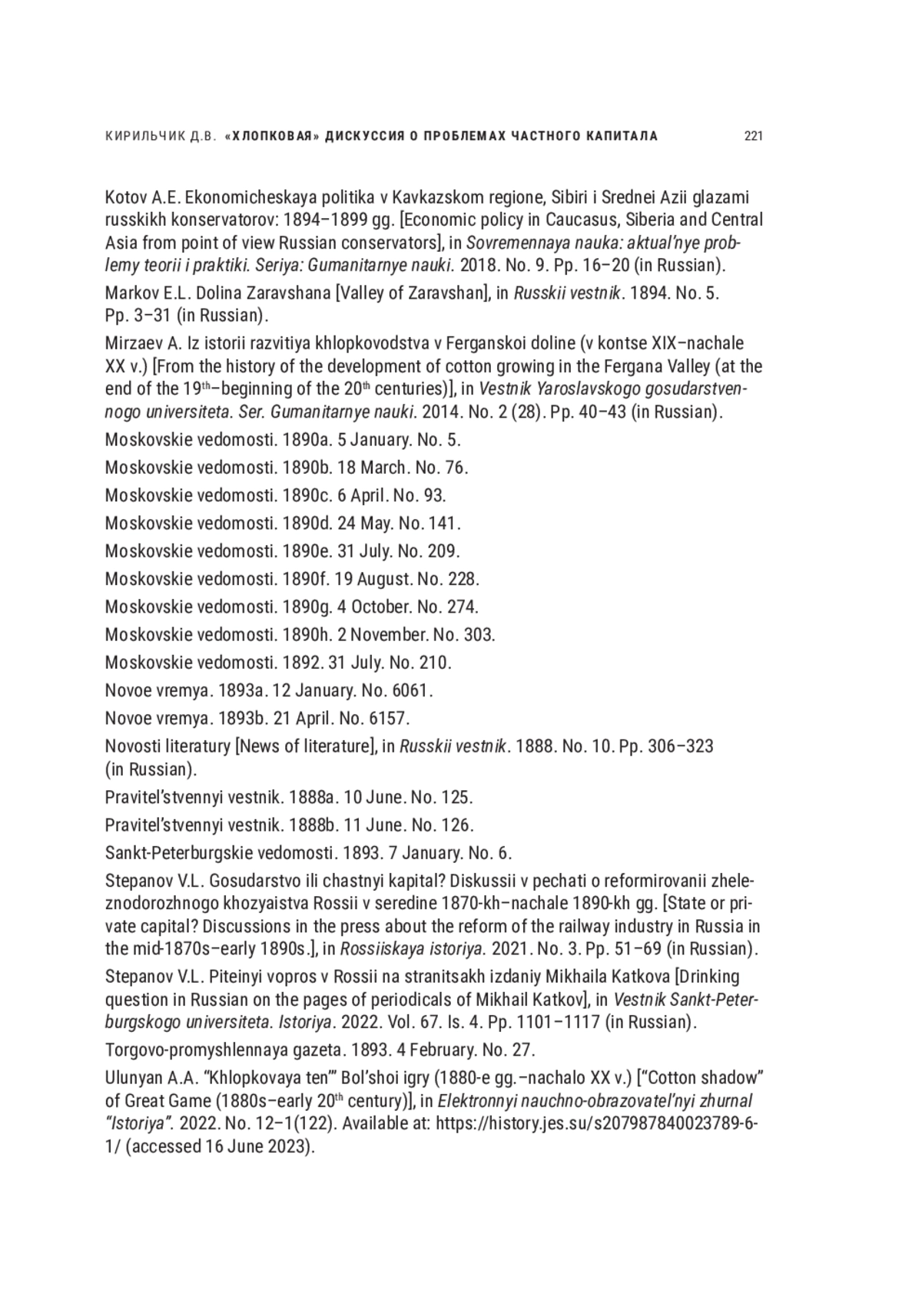 15. Кирильчик Д.В. Частный капитал в Туркестане: дискуссия на страницах периодических изданий в 1880-1910-х гг. // Вестник Московского Университета. Серия 8: История. 2022. № 4. С. 51-64. EDN: VXCSIS