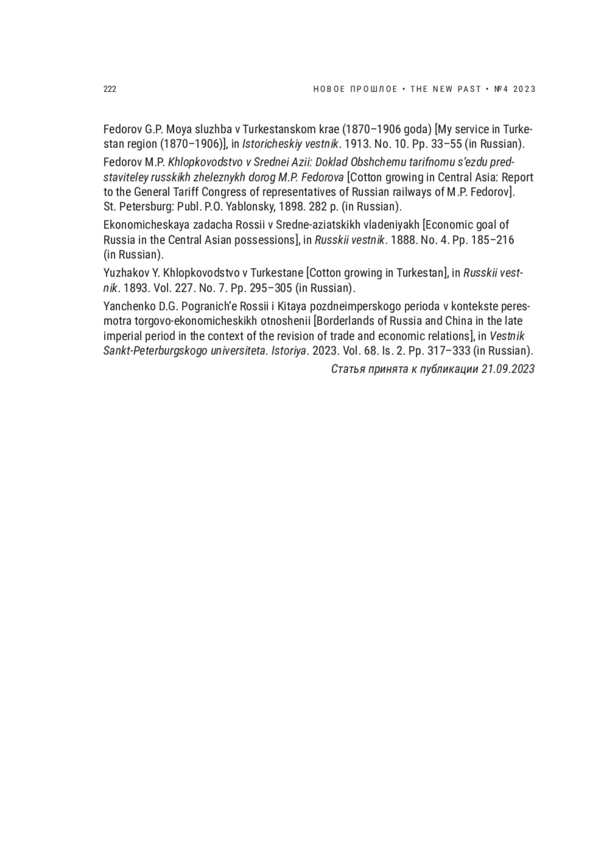 1. Брежнева С.Н., Богданова О.А. “Белое золото” Туркестанского генерал-губернаторства (попытки решения проблем хлопководства в начале XX века) // Вестник Оренбургского государственного педагогического университета. Электронный научный журнал. 2023. № 1(45). С. 45-60. EDN: EZCORM