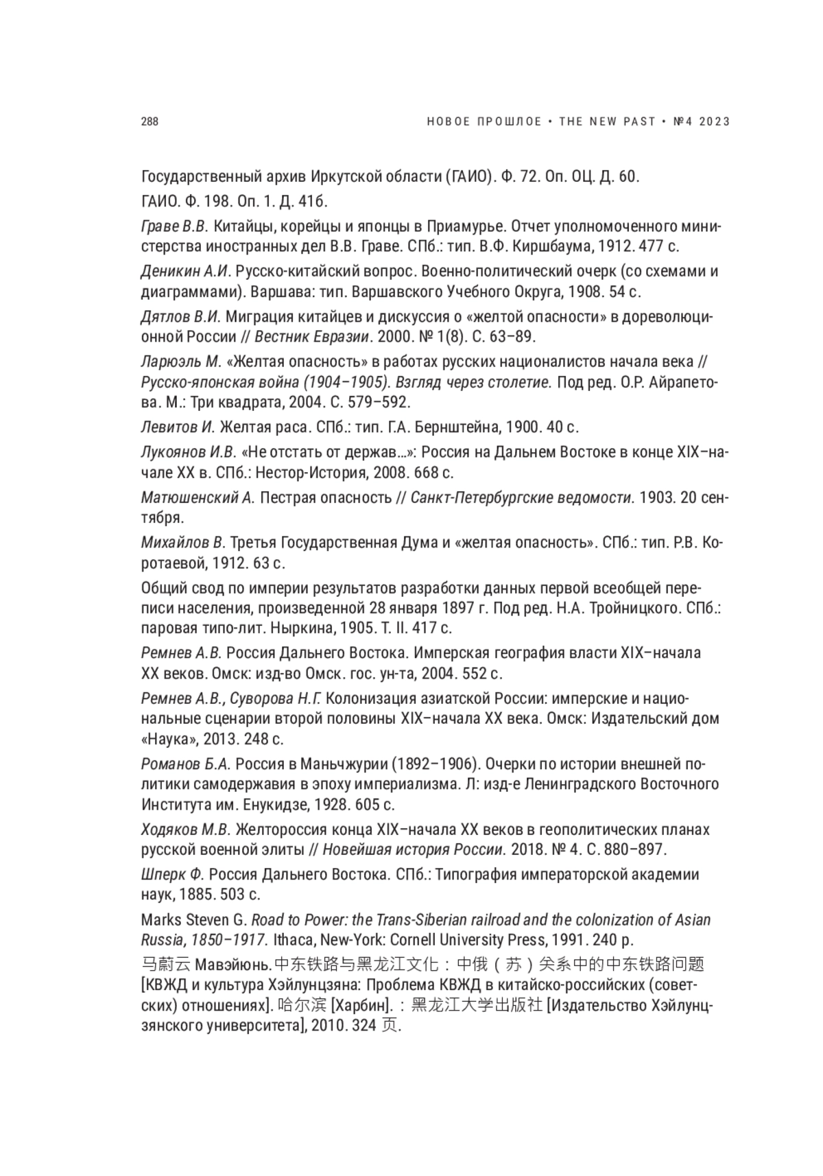 9. Дятлов В.И. Миграция китайцев и дискуссия о “желтой опасности” в дореволюционной России // Вестник Евразии. 2000. № 1 (8). С. 63-89. EDN: HYZEHH