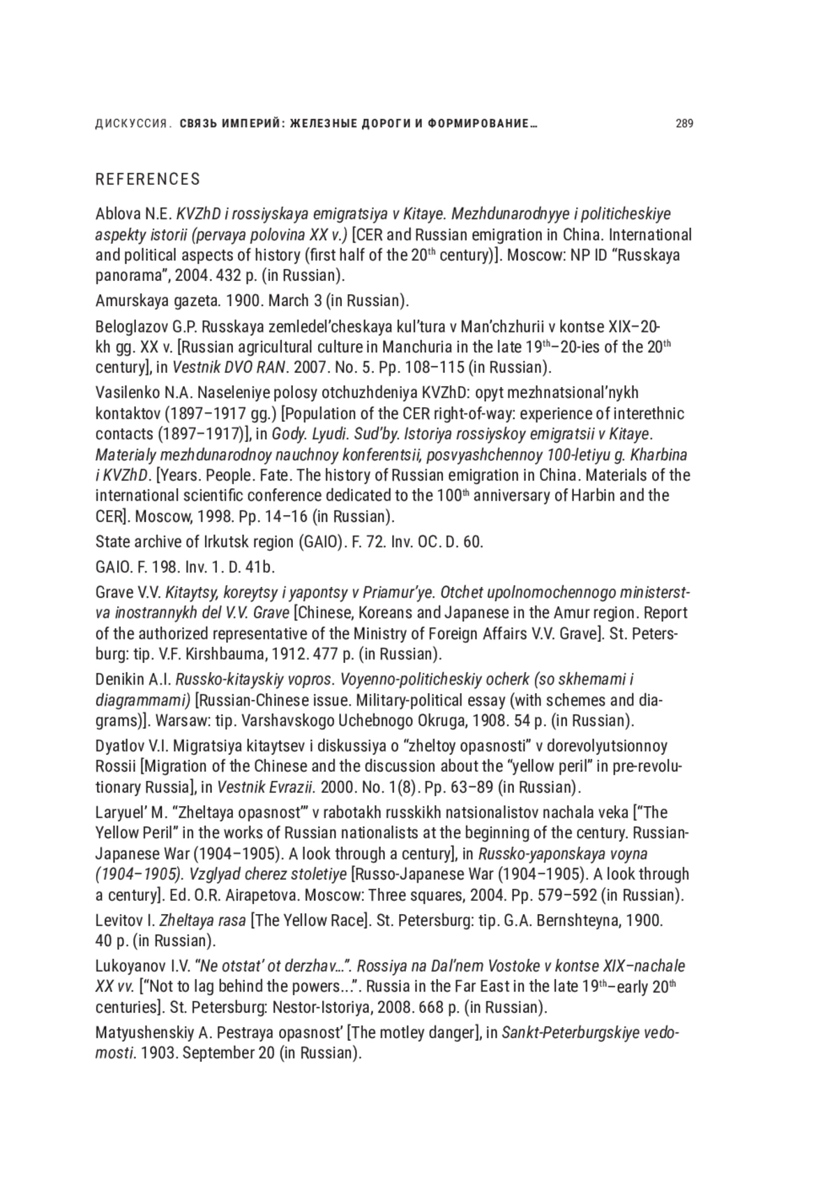 1. Аблова Н.Е. КВЖД и российская эмиграция в Китае. Международные и политические аспекты истории (первая половина XX в.). М.: НП ИД “Русская панорама”, 2004. 432 с.