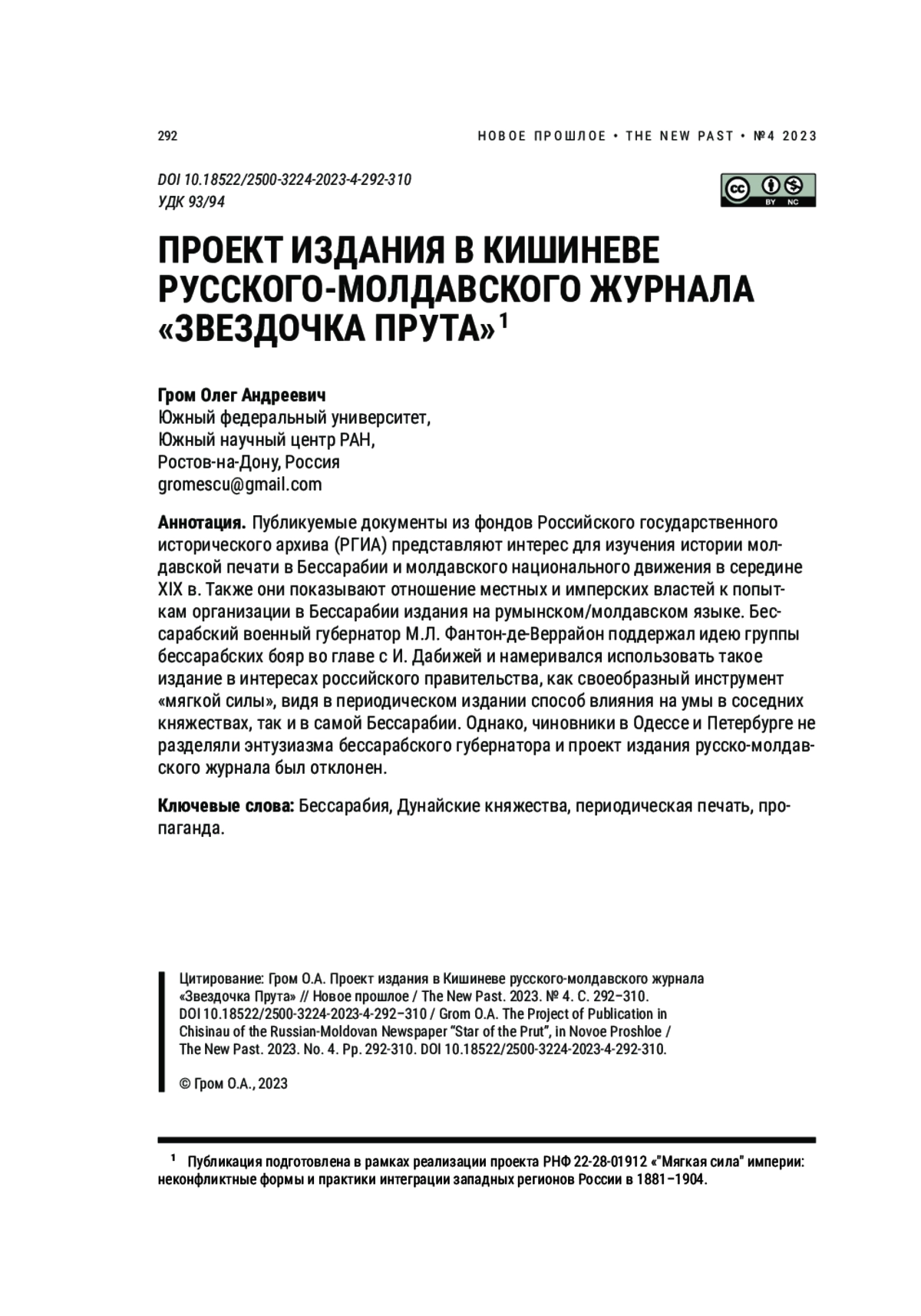 ГРОМ О. А. ПРОЕКТ ИЗДАНИЯ В КИШИНЕВЕ РУССКОГО-МОЛДАВСКОГО ЖУРНАЛА "ЗВЕЗДОЧКА ПРУТА" // НОВОЕ ПРОШЛОЕ. 2023. № 4