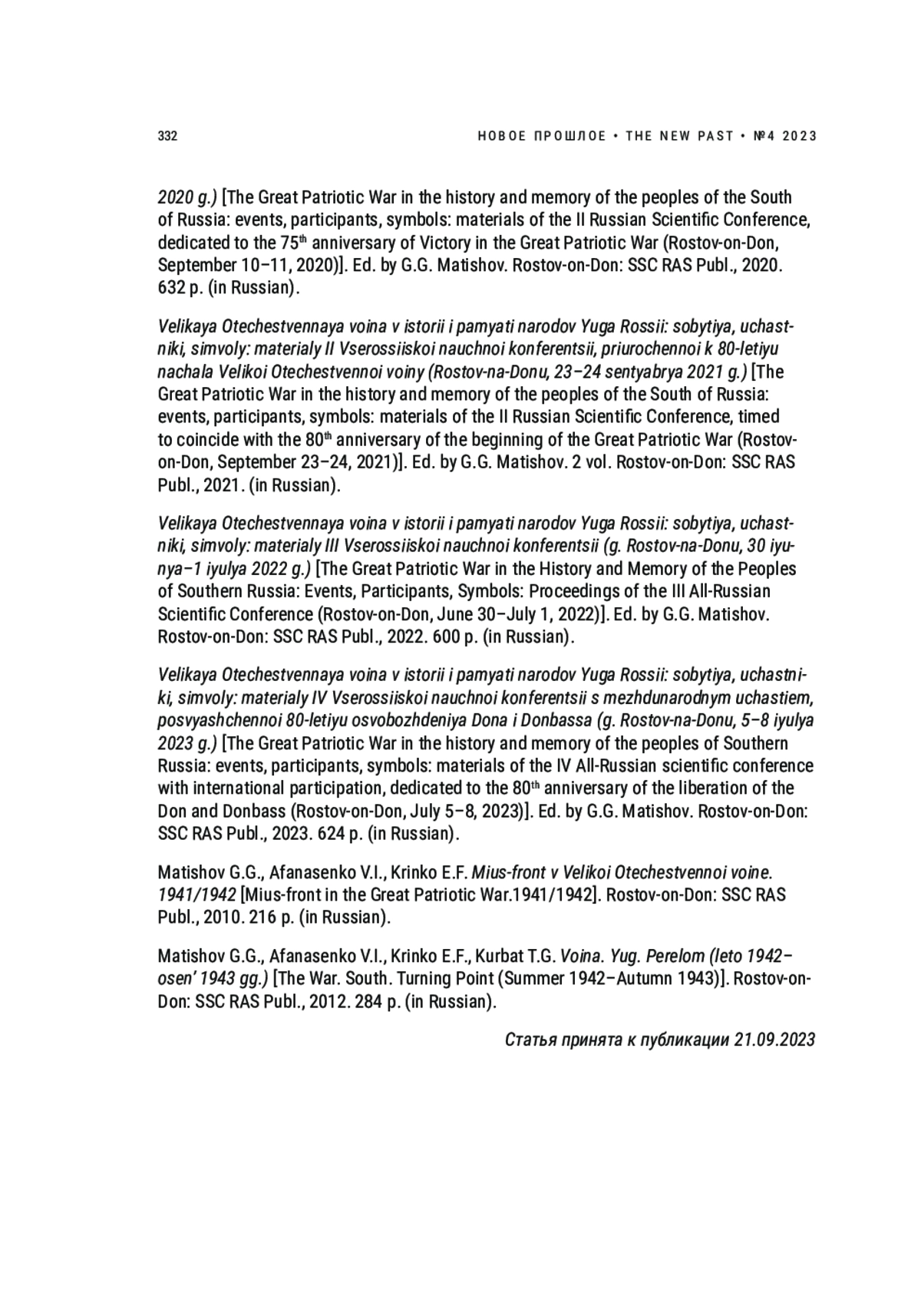 1. Великая Отечественная война в истории и памяти народов Юга России: события, участники, символы: Материалы Всероссийской научной конференции, посвященной 75-летию Победы в Великой Отечественной войне (г. Ростов-на-Дону, 10-11 сентября 2020 г.). Отв. ред. акад. Г.Г. Матишов. Ростов-на-Дону: Изд-во ЮНЦ РАН, 2020. 632 с.