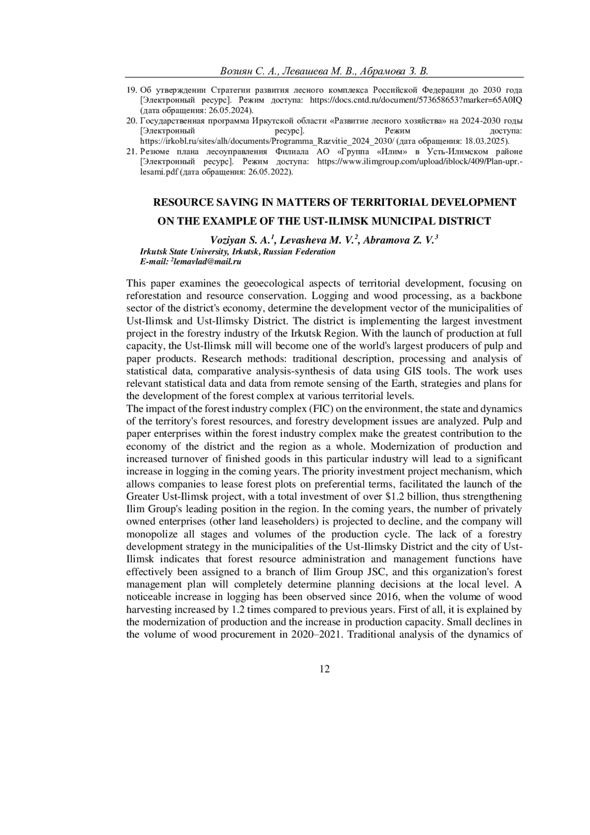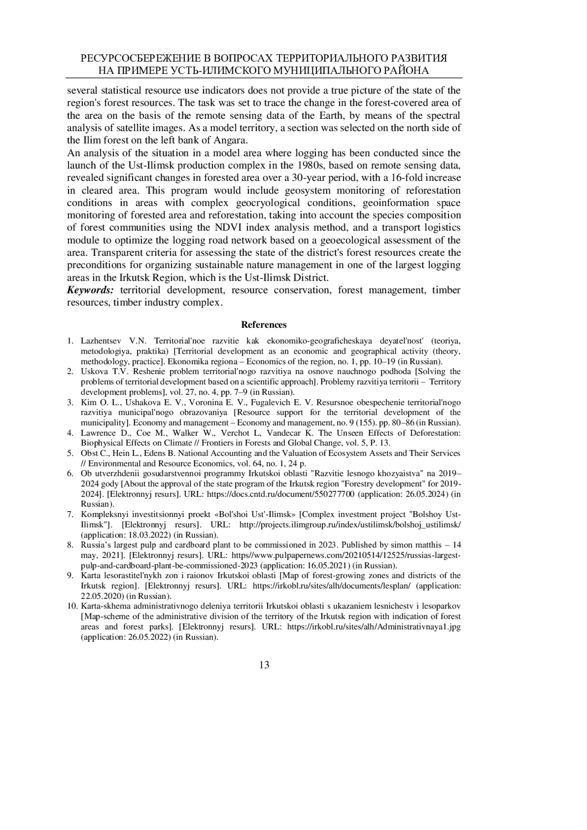В работе рассматриваются геоэкологические аспекты территориального развития, особое внимание уделяется вопросам лесовосстановления и ресурсосбережения. Лесозаготовка и деревообработка, являясь системообразующей отраслью экономики района, определяют вектор развития муниципальных образований г. Усть-Илимск и Усть-Илимский район. Анализируются виды воздействия лесопромышленного комплекса (ЛПК) на окружающую среду, состояние и динамика лесных ресурсов территории, изучаются вопросы развития лесного хозяйства. В ходе исследования выявлено, что традиционный анализ динамики ряда статистических показателей ресурсопользования не дает реальной картины состояния лесных ресурсов района.