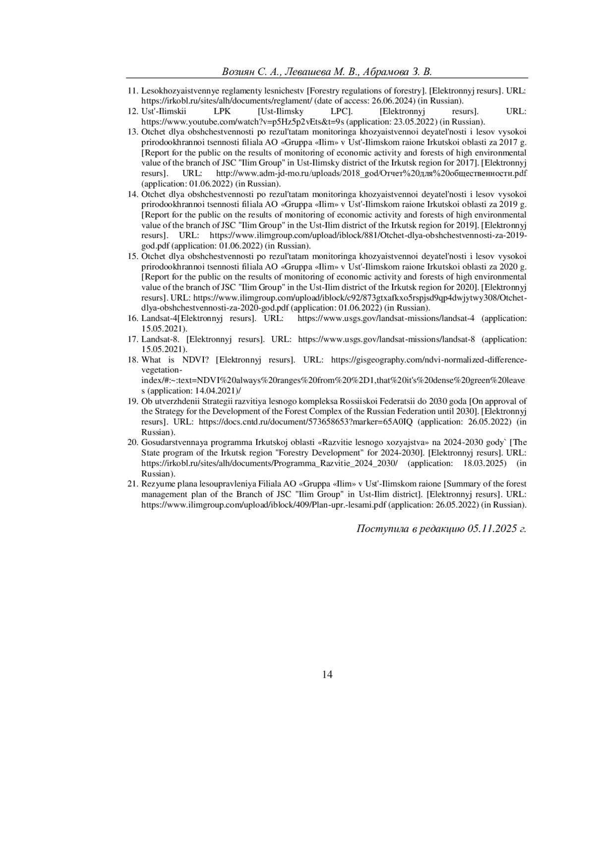 14. Отчет для общественности по результатам мониторинга хозяйственной деятельности и лесов высокой природоохранной ценности филиала АО «Группа «Илим» в Усть-Илимском районе Иркутской области за 2019 г [Электронный ресурс]. Режим доступа: https://www.ilimgroup.com/upload/iblock/881/Otchet-dlya-obshchestvennosti-za-2019-god.pdf (дата обращения: 01.06.2022).