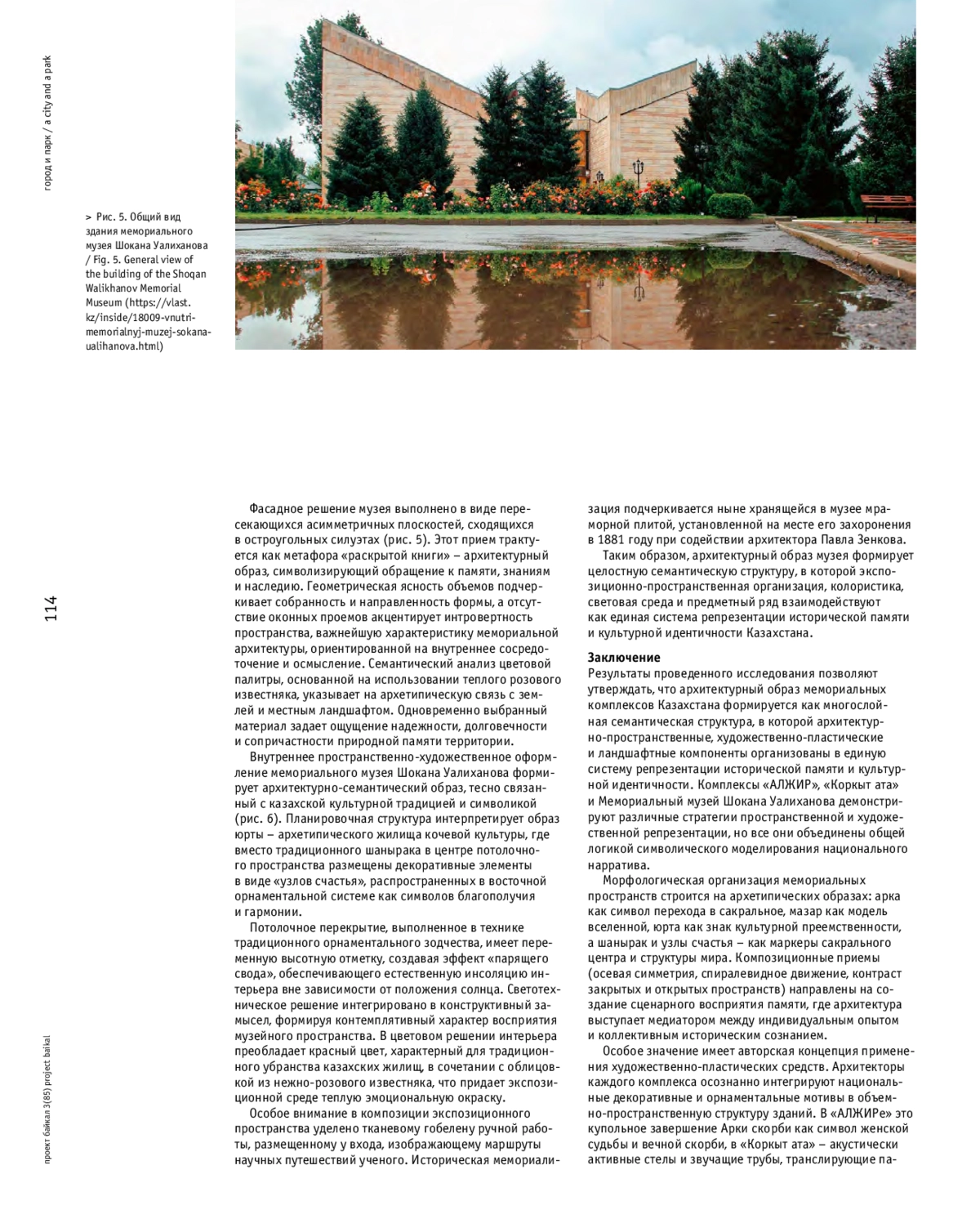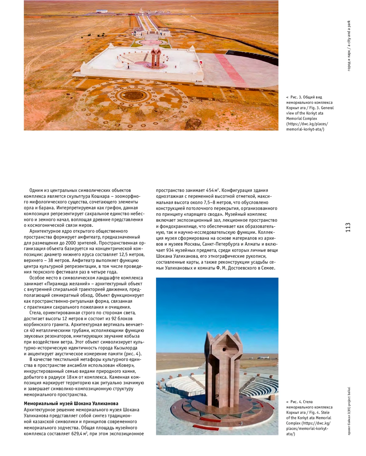 В статье исследуется архитектура трех знаковых мемориальных комплексов Казахстана, ставших символами региональной идентичности и носителями коллективной памяти. Цель работы - проанализировать архитектурные решения, определяющие образ и семантику этих объектов. В качестве методов использован комплексный анализ литературных источников и визуальных материалов для изучения формы, композиции и декоративного оформления ключевых элементов: монументальных групп, стел, арок, лестниц и ритуальных площадок. Результаты показывают, что семантический подход позволяет глубже раскрыть симво лическое содержание архитектурного образа и понять его роль в формировании и поддержании культурной идентичности общества.