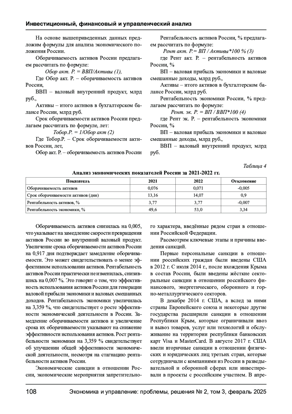 Статья посвящена исследованию влияния международных санкций на экономику России. Авторы анализируют ключевые изменения в экономической политике, адаптацию различных секторов экономики к новым условиям, а также последствия санкций для внешней торговли, финансовой системы и инвестиционного климата. На основе статистических данных бухгалтерского баланса России и экономических моделей делаются выводы о текущем состоянии экономики России и перспективах ее развития в условиях продолжающегося санкционного давления.