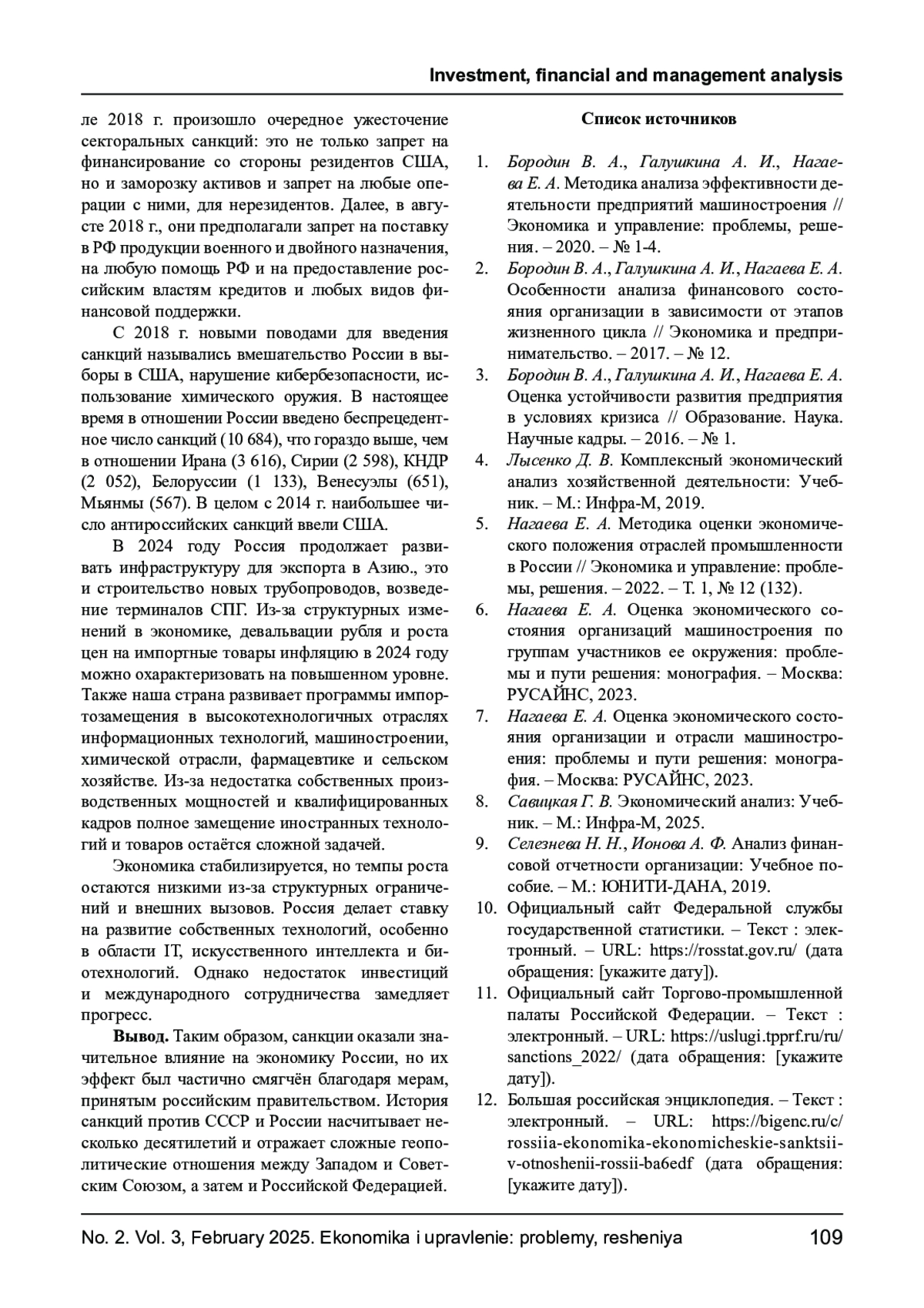 1. Бородин В. А., Галушкина А. И., Нагаева Е. А. Методика анализа эффективности деятельности предприятий машиностроения // Экономика и управление: проблемы, решения. - 2020. - № 1-4. EDN: RSGJGH