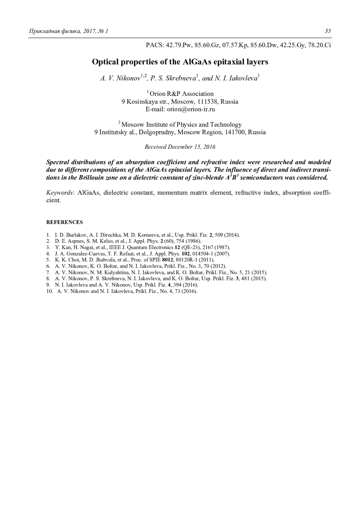 НИКОНОВ А. В., СКРЕБНЕВА П. С., ЯКОВЛЕВА Н. И. ИССЛЕДОВАНИЕ ОПТИЧЕСКИХ ХАРАКТЕРИСТИК ЭПИТАКСИАЛЬНЫХ СЛОЕВ ALGAAS // ПРИКЛАДНАЯ ФИЗИКА. 2017. №1