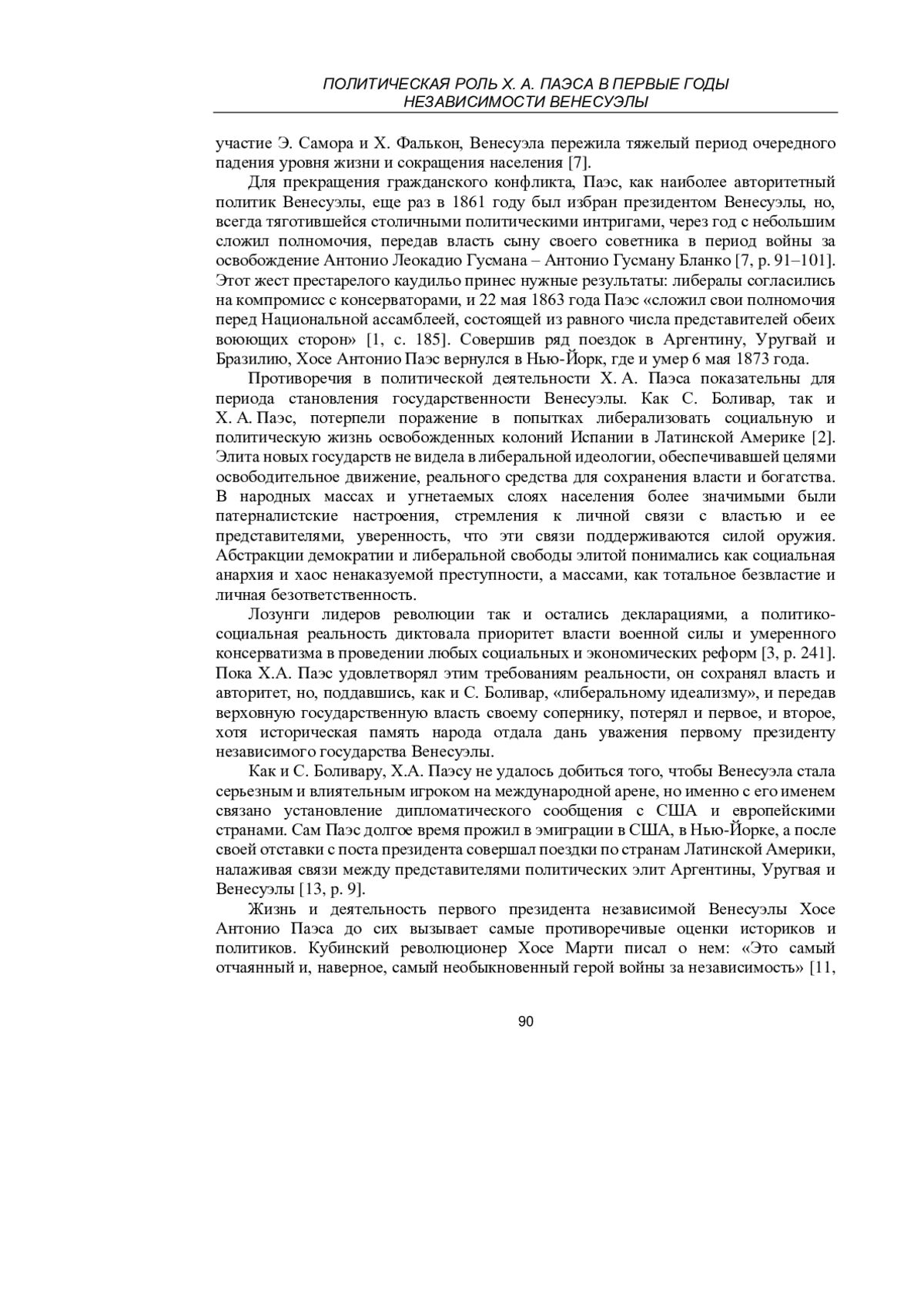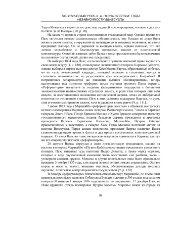 Исследуются первые годы независимости Венесуэлы после распада конфедерации Великая Колумбия и избрания президентом независимой Венесуэлы Х. А. Паэса. Изучены военно-политические конфликты в Венесуэле в первые годы ее существования и причины побед и поражений в них Х. А. Паэса. Противоречивая фигура Х. А. Паэса, негативно оценивавшаяся в советской исторической школе, тем не менее, играет значительную роль в процессе политического становления независимой Венесуэлы, и изучение того, как и почему именно Х. А. Паэс стал одним из военных вождей освободительного движения под руководством С. Боливара, а затем, порвав с С. Боливаром, оказался первым политическим лидером независимой Венесуэлы, является условием объективного взгляда на историю Венесуэлы, взгляда, свободного от идеологической критики, но также, свободного от апологетики, которая была присуща многим исследованиям, как на западе, так и в самой Венесуэле. Последовательное рассмотрение фактов биографии первого венесуэльского президента дает базисную фатологию для научного исторического анализа событий начального этапа истории этой страны.