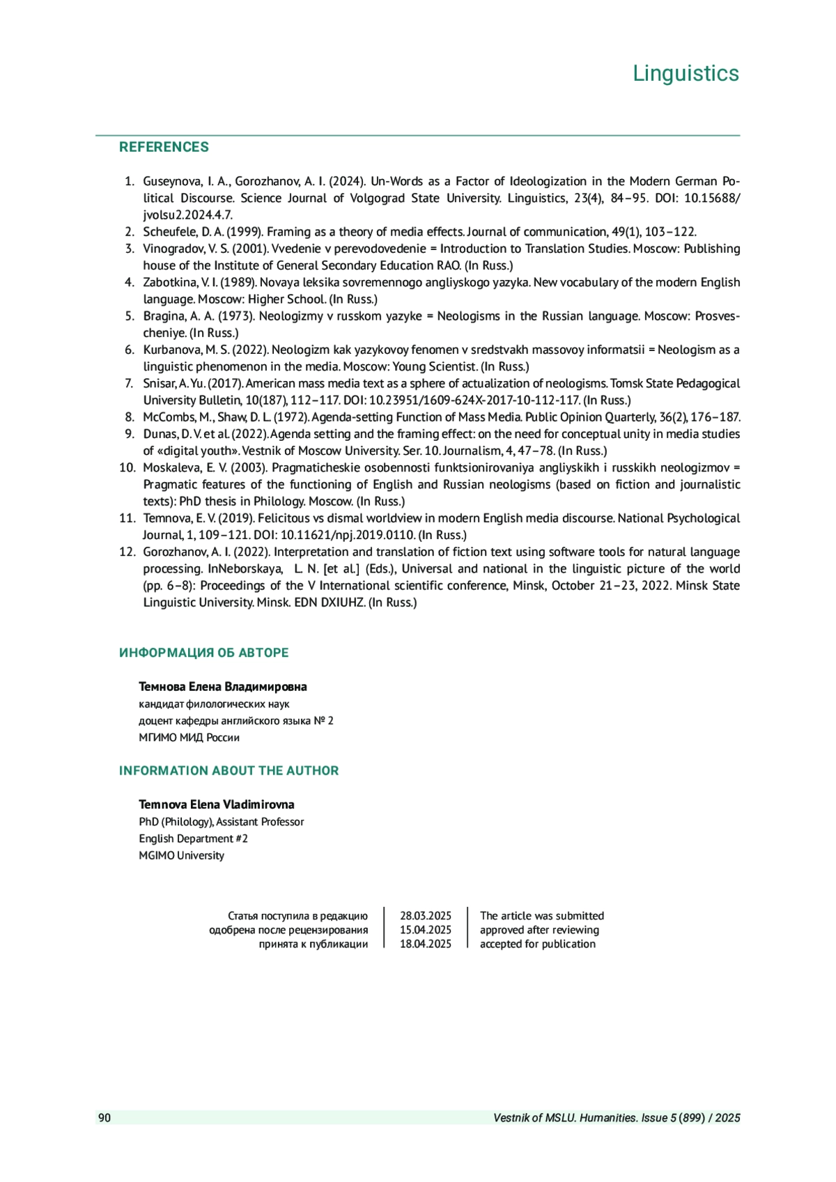 1. Guseynova I. A., Gorozhanov A. I. Un-Words as a Factor of Ideologization in the Modern German Political Discourse. Science Journal of Volgograd State University. Linguistics. 2024. Vol. 23. No. 4. P. 84-95. 10.15688/ jvolsu2.2024.4.7. DOI: 10.15688/jvolsu2.2024.4.7 EDN: XMNCZX