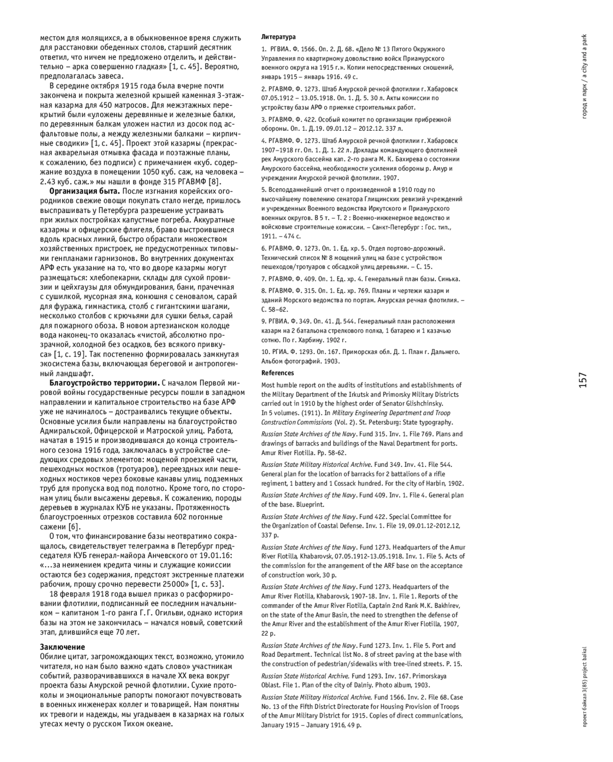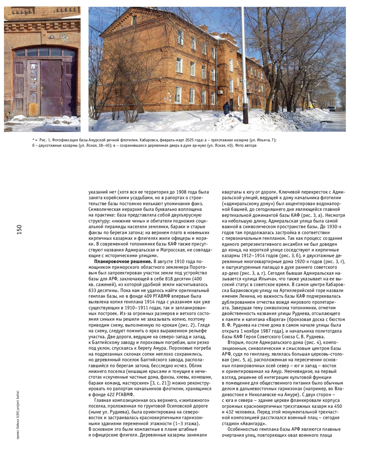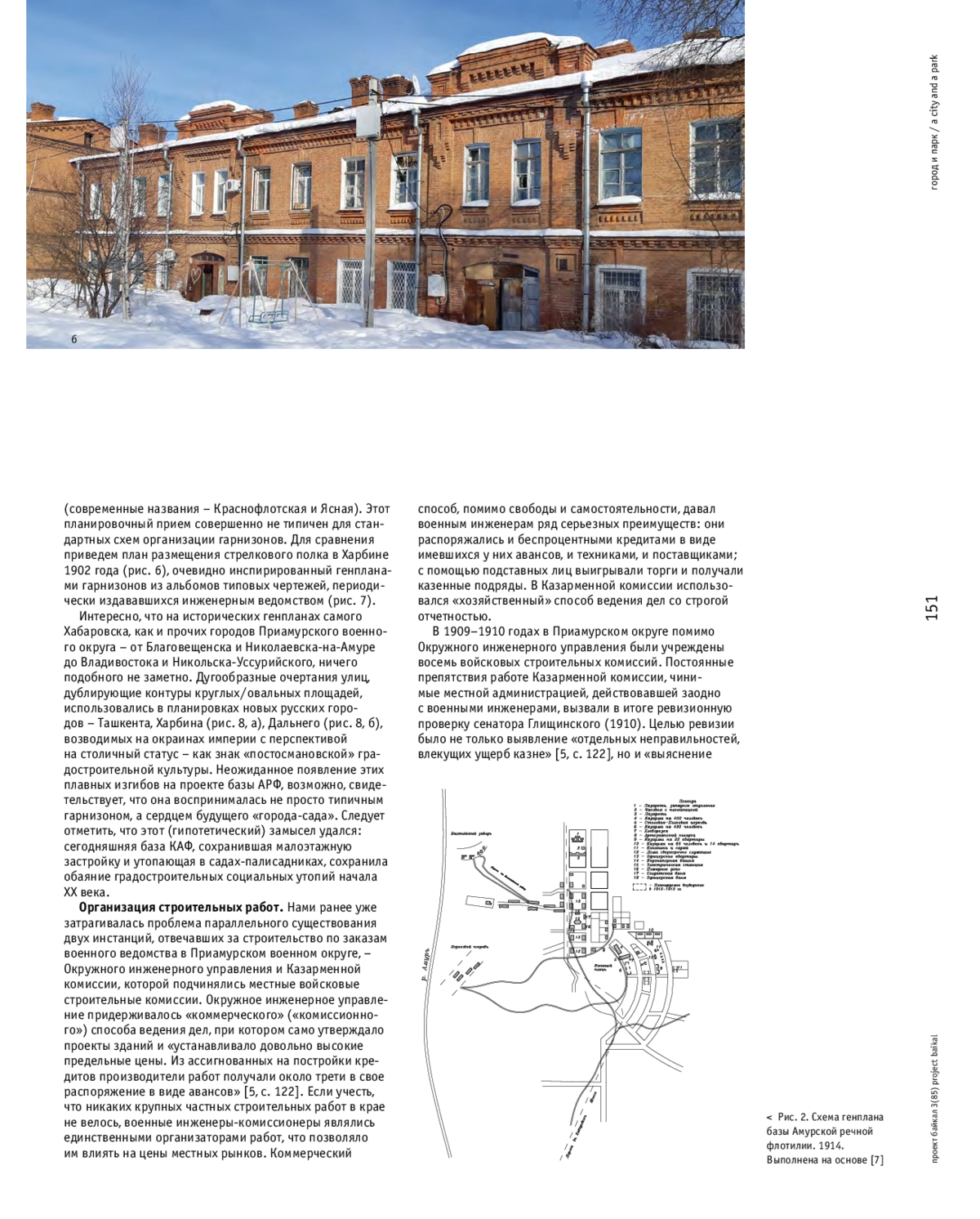 Объектом исследования является архитектурно-градостроительный ансамбль базы Амурской речной флотилии (АРФ) в Осиповском затоне под Хабаровском, анализируемый на трех уровнях – планировочном, архитектурном и символическом. В Хабаровске, Владивостоке, Уссурийске и Николаевске-на-Амуре военные городки и отдельные постройки 1900–1914 годов, возведенные военным ведомством, хорошо сохранились и почти все продолжают использоваться силовыми структурами, что делает затруднительным натурное обследование и тем более публикацию фотографий, фиксирующих современное состояние объектов. В качестве примера можно привести краснокирпичные ансамбли Хабаровского гарнизона (сегодня – так называемый Волочаевский городок), Николаевских казарм на Первой Речке и казарм 9‑го Восточно-Сибирского стрелкового полка на Второй Речке во Владивостоке.
