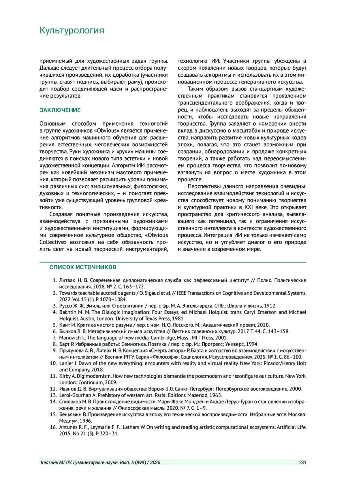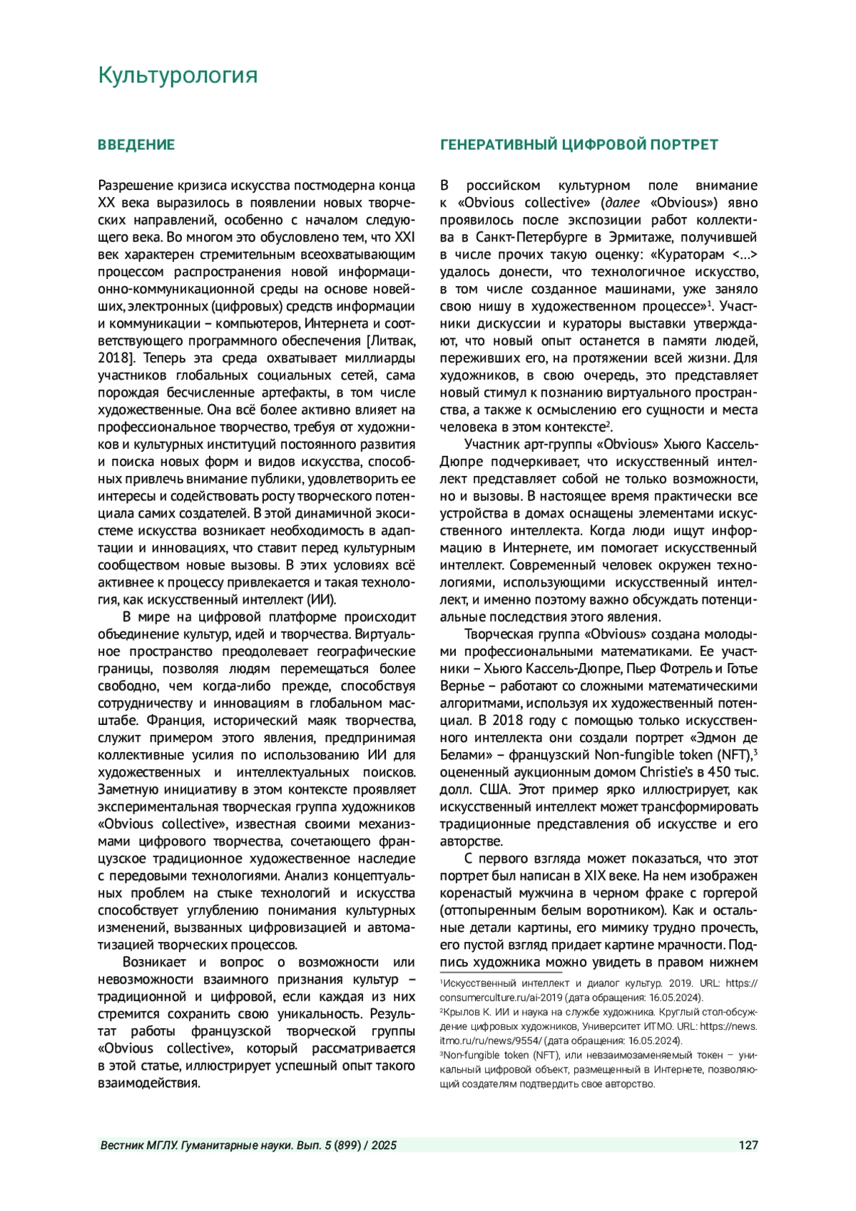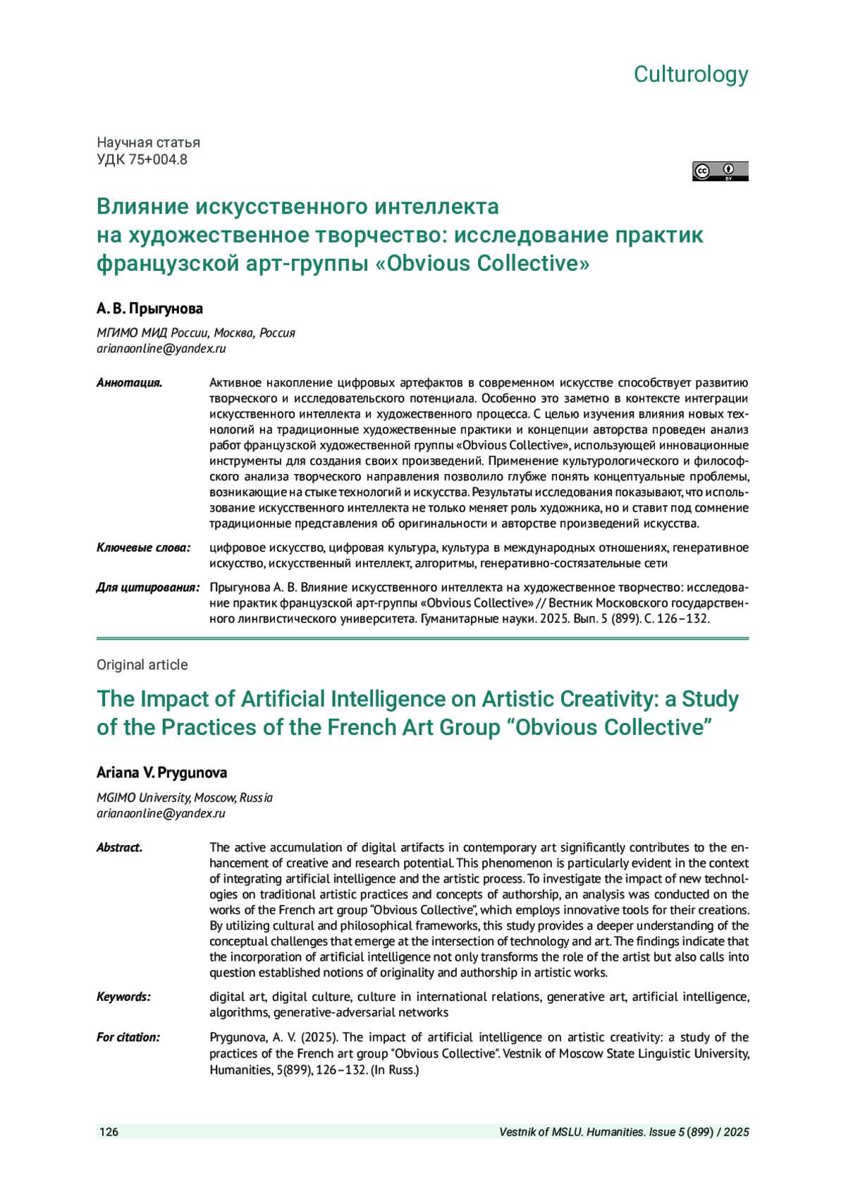 Активное накопление цифровых артефактов в современном искусстве способствует развитию творческого и исследовательского потенциала. Особенно это заметно в контексте интеграции искусственного интеллекта и художественного процесса. С целью изучения влияния новых технологий на традиционные художественные практики и концепции авторства проведен анализ работ французской художественной группы «Obvious Collective», использующей инновационные инструменты для создания своих произведений. Применение культурологического и философского анализа творческого направления позволило глубже понять концептуальные проблемы, возникающие на стыке технологий и искусства. Результаты исследования показывают, что использование искусственного интеллекта не только меняет роль художника, но и ставит под сомнение традиционные представления об оригинальности и авторстве произведений искусства.