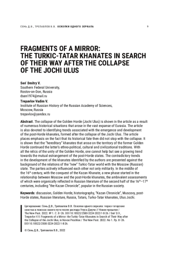 Распад Золотой Орды (Улуса Джучи) показан в статье как следствие многочисленных исторических ситуаций, возникших на обширном пространстве Евразии. Статья также посвящена выявлению тенденций, связанных с возникновением и развитием постордынских ханств, образовавшихся после распада Улуса Джучи. Показано, что возникшие на территории бывшей Золотой Орды «наследные» ханства продолжили золотоордынские этнополитические и культурно-цивилизационные традиции. Сделан вывод о том, что при всех реликтах единства Золотой Орды нельзя не видеть усиливавшуюся тенденцию к взаимному отдалению постордынских государств друг от друга. Выявленные авторами противоречивые тенденции развития ханств представлены на фоне отношений «нового» тюрко-татарского мира с Московским (Российским) государством. Стороны активно влияли друг на друга не только в военном отношении. В середине XVI в., с завоеванием Казанского ханства, начался новый этап во взаимоотношениях Москвы и постордынских ханств, амбивалентные оценки которых органично отразились в русской литературе второй половины XVI–XVII вв., включая популярную в российском обществе «Казанскую историю»