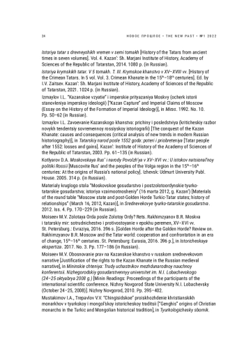 22. Моисеев М.В. Золотая Орда после Золотой Орды? Рец. Рахимзянов Б. Р. Москва и татарский мир: сотрудничество и противостояние в эпоху перемен, XV-XVI вв. СПб.: Евразия, 2016. 396 с. // Историческая экспертиза. 2017. № 3. С. 177-186. EDN: YQVBMM