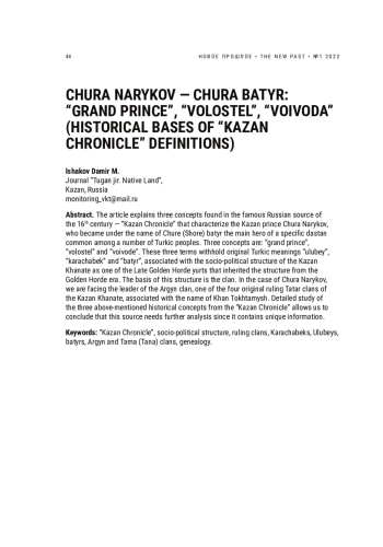 Статья посвящена объяснению встречающихся в «Казанской истории», известном русском источнике XVI в., трех определений, примененных по отношению к казанскому князю Чуре Нарыкову, ставшему под именем Чуры (Шоры) батыра главным героем распространенного у ряда тюркских народов специального дастана. Это понятия «большой князь», «волостель» и «воевода». Под ними на самом деле скрываются тюркские термины «улубий», «карачабек» и «батыр», связанные с социально-политической структурой Казанского ханства как одного из позднезолотоордынских юртов, унаследовавшего эту структуру от эпохи Золотой Орды. Она базировалась на клановых принципах, и в случае Чуры Нарыкова мы имеем дело с вождем клана аргын — одного из четырех правивших первоначальных татарских кланов Казанского ханства, связанных еще с ханом Тохтамышем. В целом детальное изучение содержащихся в «Казанской истории» названных трех исторических понятий позволяет заключить, что данный источник нуждается в дальнейшем анализе, поскольку содержит уникальные сведения