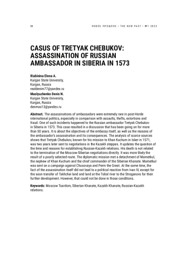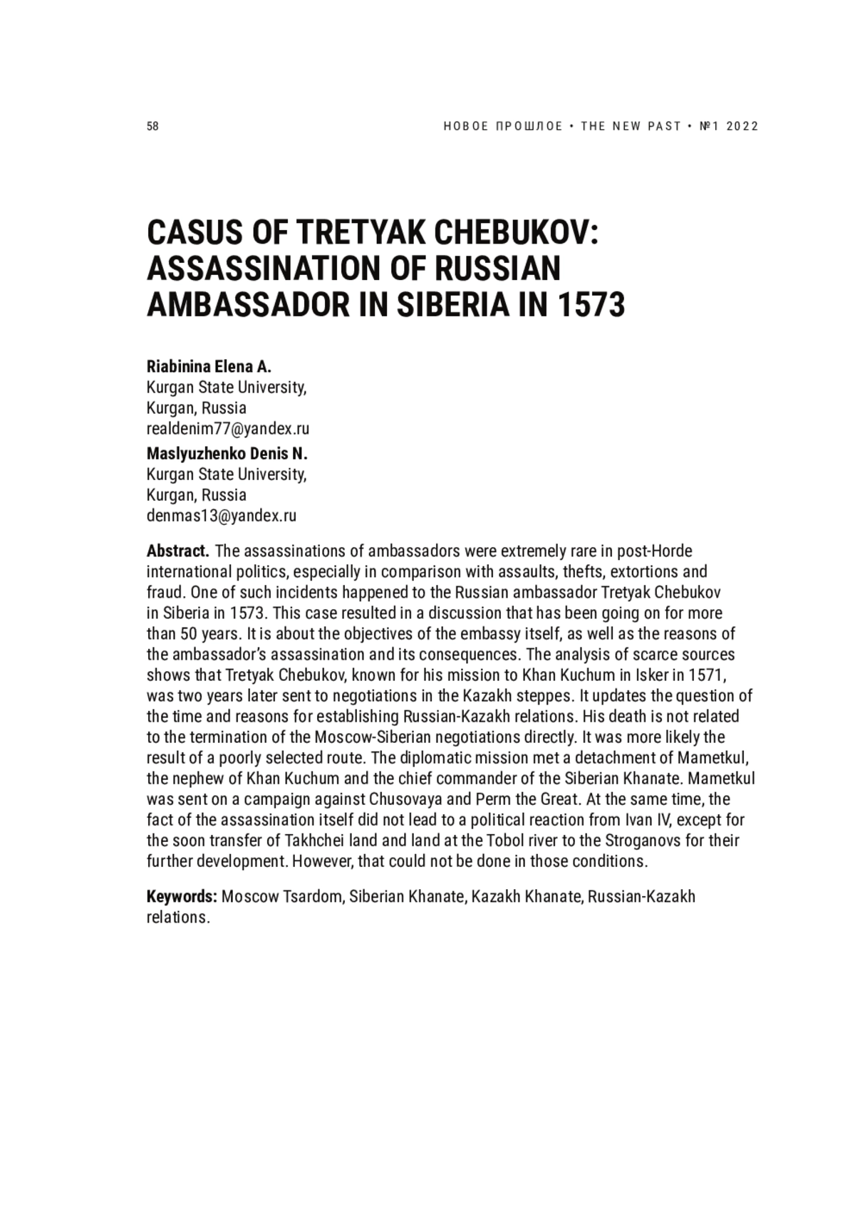 РЯБИНИНА Е. А., МАСЛЮЖЕНКО Д. Н. КАЗУС ТРЕТЬЯКА ЧЕБУКОВА: УБИЙСТВО РУССКОГО ПОСЛА В СИБИРИ В 1573 ГОДУ // НОВОЕ ПРОШЛОЕ. 2022. № 1