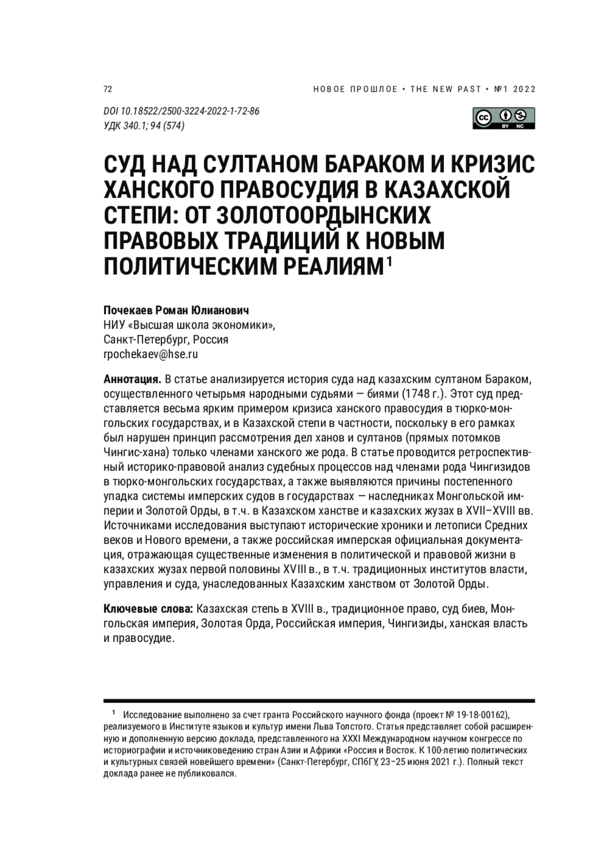 В статье анализируется история суда над казахским султаном Бараком, осуществленного четырьмя народными судьями — биями (1748 г.). Этот суд представляется весьма ярким примером кризиса ханского правосудия в тюрко-монгольских государствах, и в Казахской степи в частности, поскольку в его рамках был нарушен принцип рассмотрения дел ханов и султанов (прямых потомков Чингис-хана) только членами ханского же рода. В статье проводится ретроспективный историко-правовой анализ судебных процессов над членами рода Чингизидов в тюрко-монгольских государствах, а также выявляются причины постепенного упадка системы имперских судов в государствах — наследниках Монгольской империи и Золотой Орды, в т. ч. в Казахском ханстве и казахских жузах в XVII–XVIII вв. Источниками исследования выступают исторические хроники и летописи Средних веков и Нового времени, а также российская имперская официальная документация, отражающая существенные изменения в политической и правовой жизни в казахских жузах первой половины XVIII в., в т. ч. традиционных институтов власти, управления и суда, унаследованных Казахским ханством от Золотой Орды