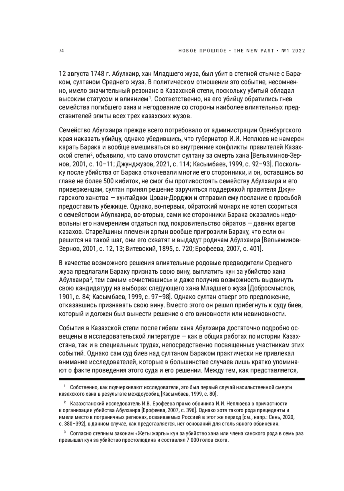 12 августа 1748 г. Абулхаир, хан Младшего жуза, был убит в степной стычке с Бараком, султаном Среднего жуза. В политическом отношении это событие, несомненно, имело значительный резонанс в Казахской степи, поскольку убитый обладал высоким статусом и влиянием 1. Соответственно, на его убийцу обратились гнев семейства погибшего хана и негодование со стороны наиболее влиятельных представителей элиты всех трех казахских жузов