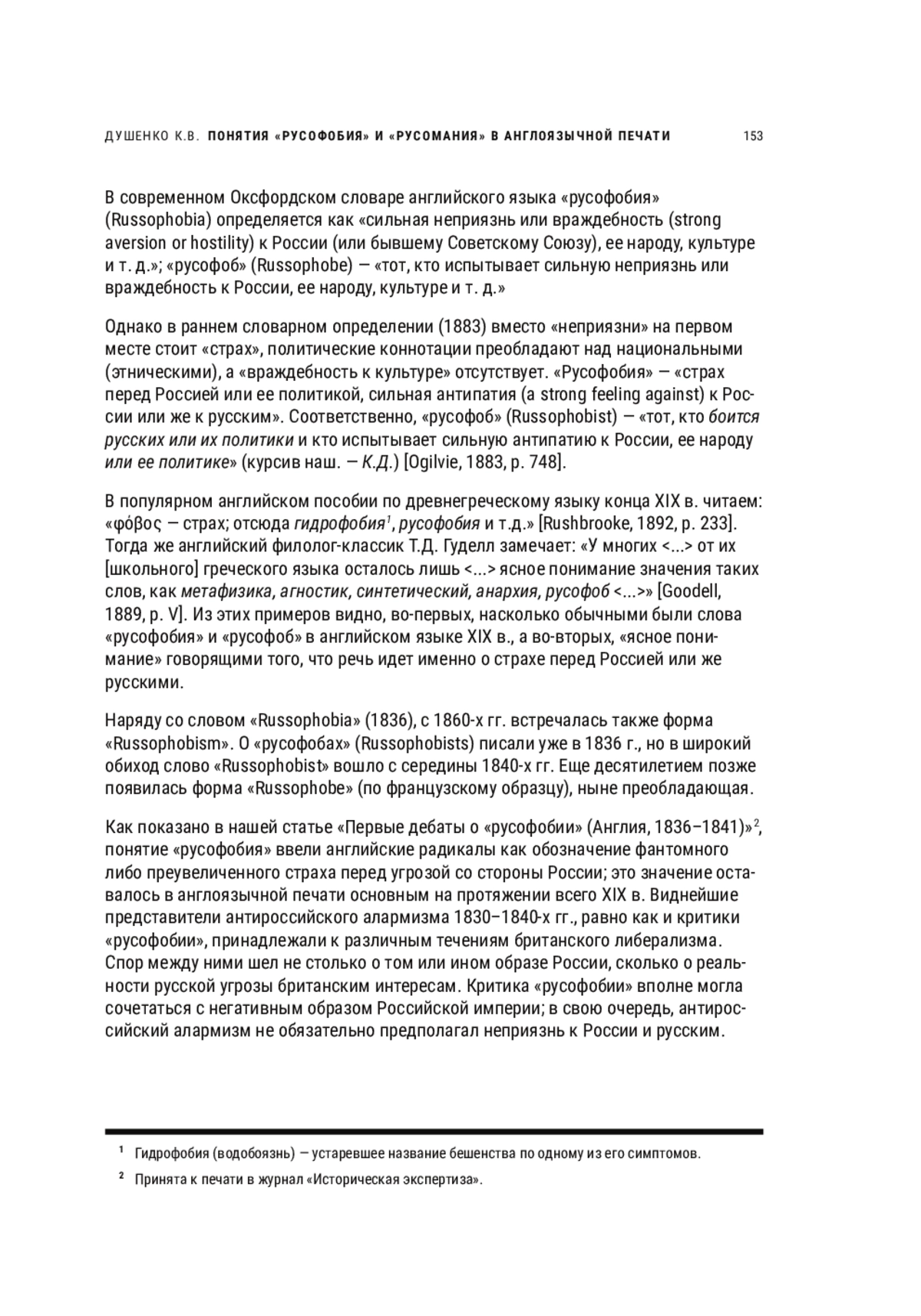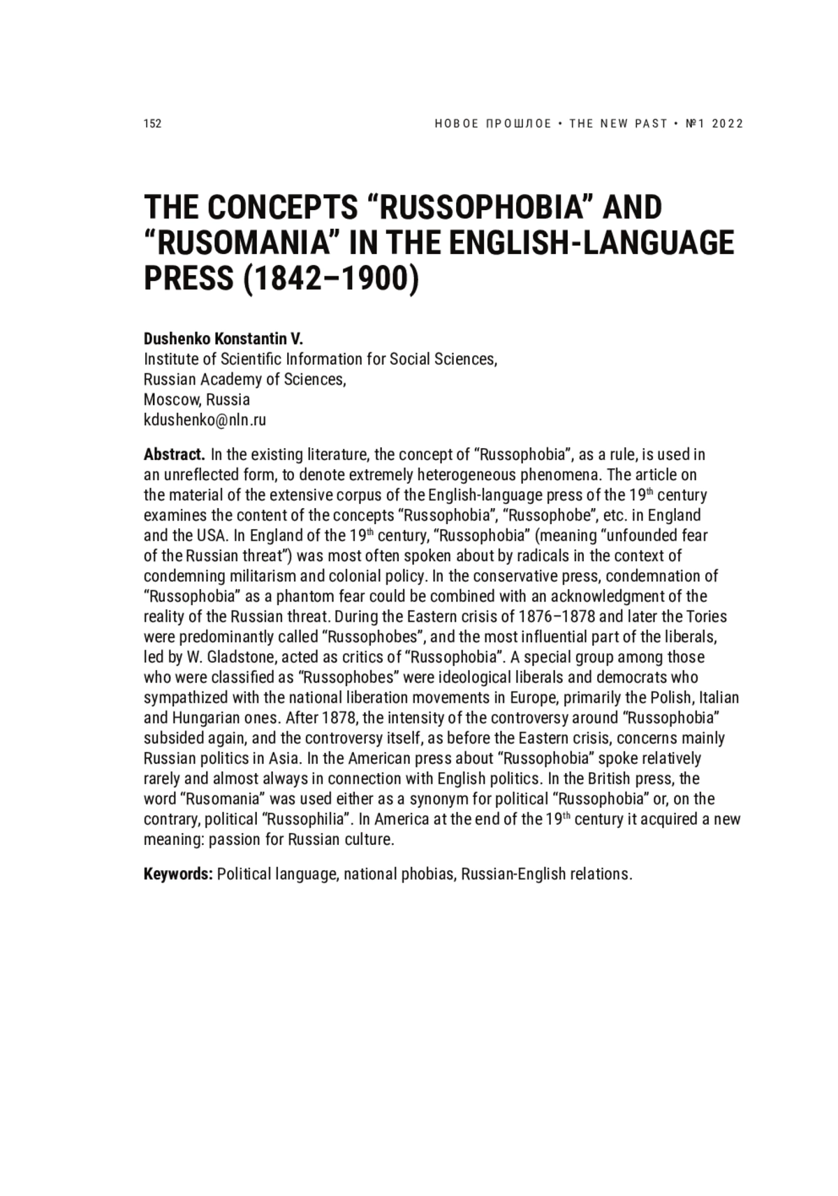 В существующей литературе понятие «русофобия», как правило, используется в неотрефлектированном виде, для обозначения крайне разнородных явлений. В статье на материале обширного корпуса англоязычной печати XIX в. исследуется содержание понятий «русофобия», «русофоб» и т. д. в Англии и США. О «русофобии» (в значении «необоснованный страх перед русской угрозой») чаще всего говорили радикалы в контексте осуждения милитаризма и колониальной политики. В консервативной печати осуждение «русофобии» как фантомного страха могло сочетаться с признанием реальности русской угрозы. Во время Восточного кризиса 1876–1878 гг. и позже «русофобами» именовались по преимуществу тори, а в качестве критиков «русофобии» выступала наиболее влиятельная часть либералов во главе с У. Гладстоном. Особую группу среди причислявшихся к «русофобам» составляли идейные либералы и демократы, сочувствовавшие национально-освободительным движениям в Европе, прежде всего польскому, итальянскому и венгерскому. После 1878 г. накал полемики вокруг «русофобии» снова спадает, а сама полемика, как и перед Восточным кризисом, касается главным образом русской политики в Азии. В американской печати о «русофобии» говорилось сравнительно редко, и почти всегда по поводу английской политики. Слово «русомания» в британской печати использовалось либо как синоним политической «русофобии», либо, напротив, политической «русофилии». В Америке конца XIX в. оно получило новое значение: увлечение русской культурой