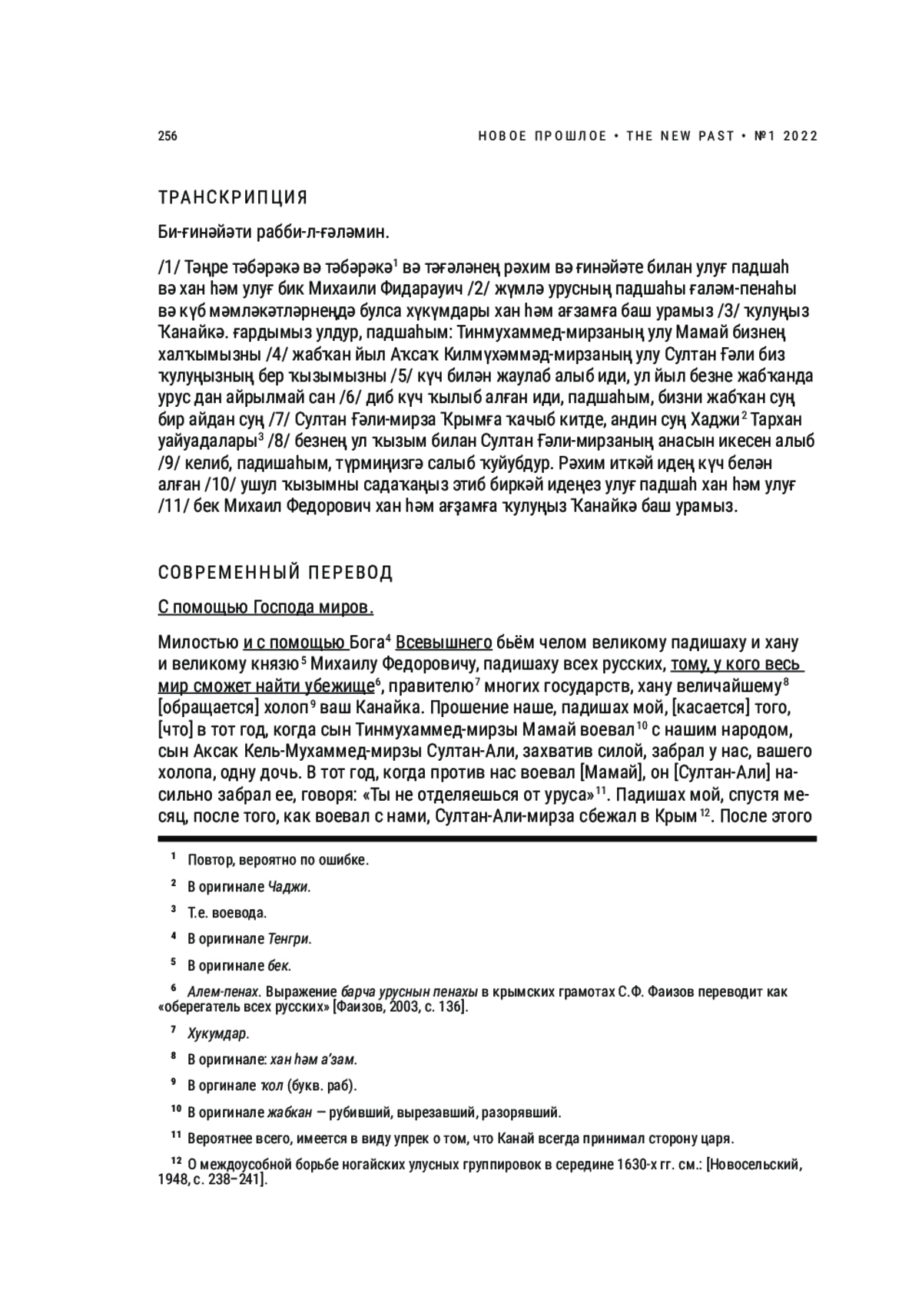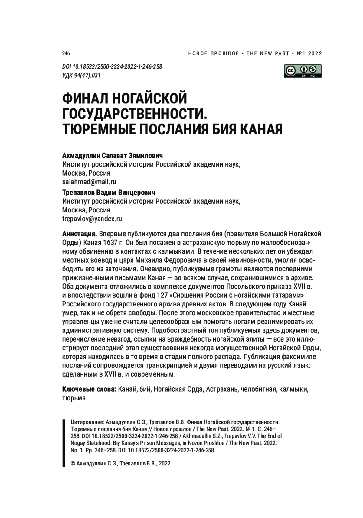 Впервые публикуются два послания бия (правителя Большой Ногайской Орды) Каная 1637 г. Он был посажен в астраханскую тюрьму по малообоснованному обвинению в контактах с калмыками. В течение нескольких лет он убеждал местных воевод и царя Михаила Федоровича в своей невиновности, умоляя освободить его из заточения. Очевидно, публикуемые грамоты являются последними прижизненными письмами Каная — во всяком случае, сохранившимися в архиве. Оба документа отложились в комплексе документов Посольского приказа XVII в. и впоследствии вошли в фонд 127 «Сношения России с ногайскими татарами» Российского государственного архива древних актов. В следующем году Канай умер, так и не обретя свободы. После этого московское правительство и местные управленцы уже не считали целесообразным помогать ногаям реанимировать их административную систему. Подобострастный тон публикуемых здесь документов, перечисление невзгод, ссылки на враждебность ногайской элиты — все это иллюстрирует последний этап существования некогда могущественной Ногайской Орды, которая находилась в то время в стадии полного распада. Публикация факсимиле посланий сопровождается транскрипцией и двумя переводами на русский язык: сделанным в XVII в. и современным.