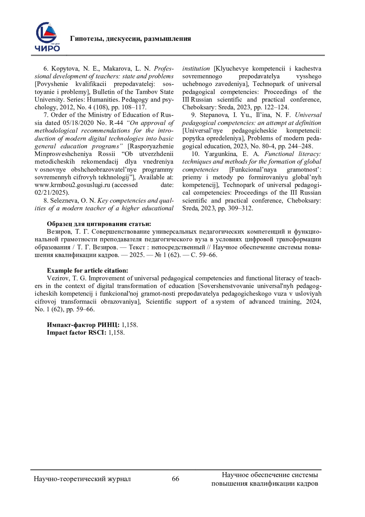 9. Степанова, И. Ю. Универсальные педагогические компетенции: попытка определения / И. Ю. Степанова, Н. Ф. Ильина. - Текст: непосредственный // Проблемы современного педагогического образования. - 2023. - № 80-4. - С. 244-248. EDN: XNKNKR