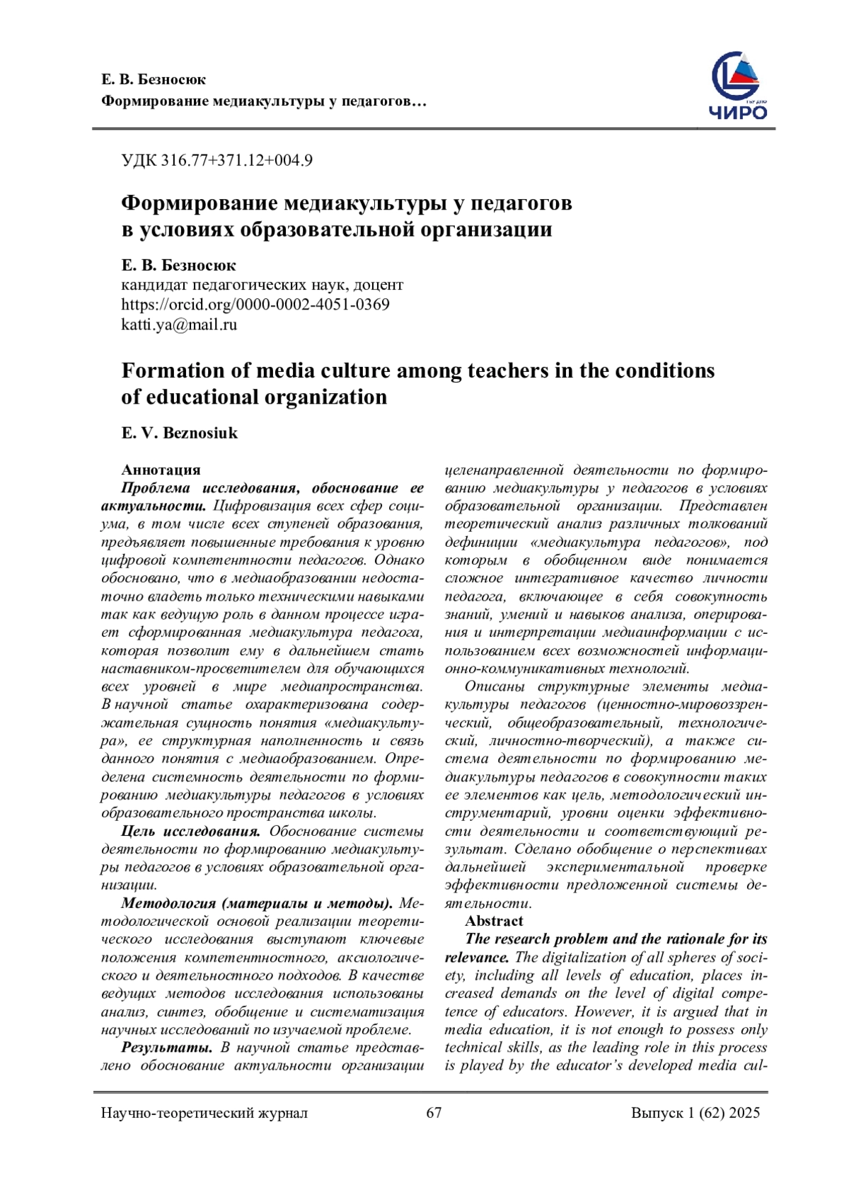 1. Сафонов, В. И. Медиакультура будущего педагога в информационно-образовательной среде педвуза / В. И. Сафонов. - Текст: непосредственный // Национальные тенденции в современном образовании: сборник статей III Всероссийской научно-практической конференции, Омск, 25 декабря 2020 года. Том Часть 5. - Омск: Омская гуманитарная академия, 2021. - С. 60-63. EDN: CUIJMV