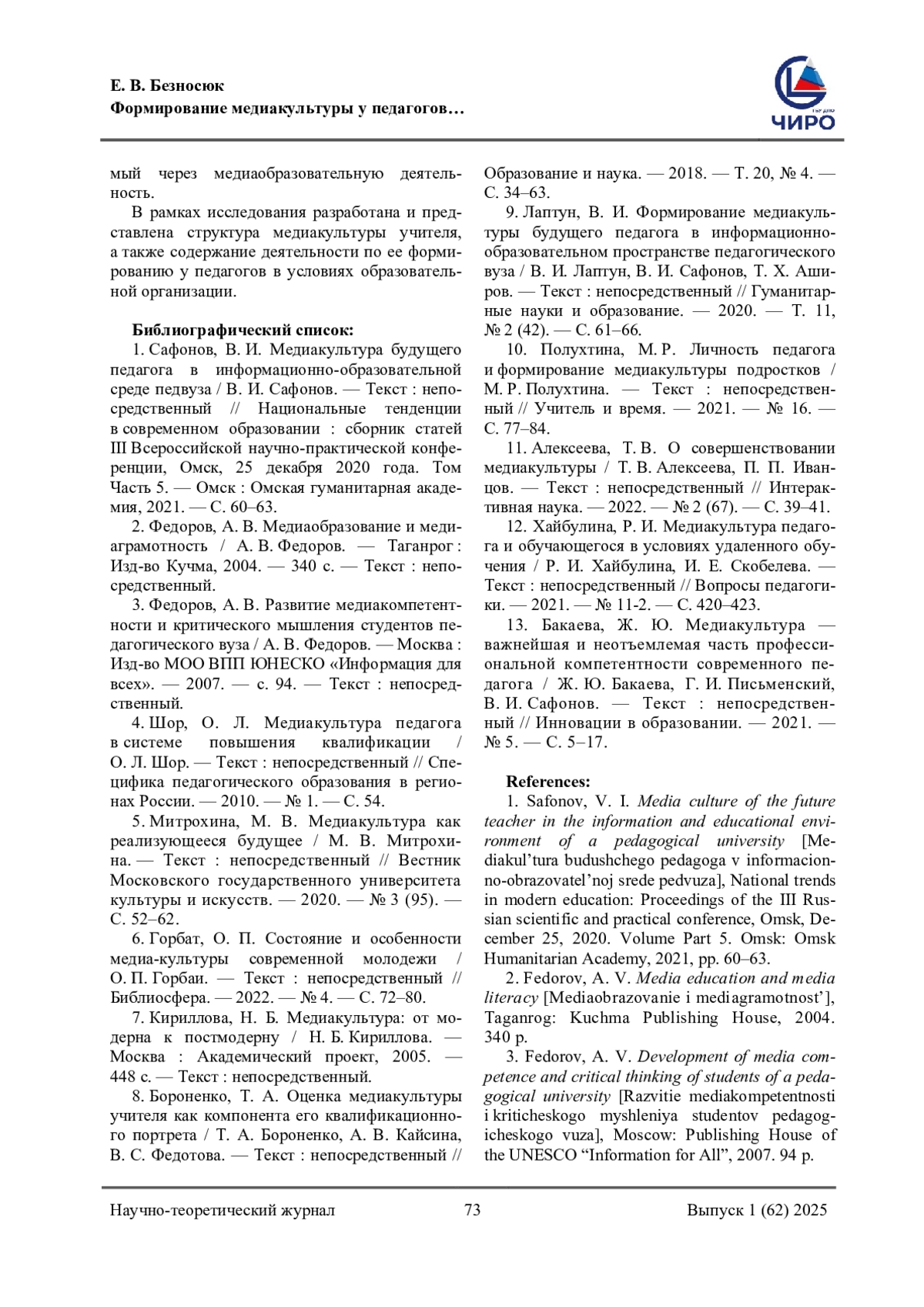 13. Бакаева, Ж. Ю. Медиакультура - важнейшая и неотъемлемая часть профессиональной компетентности современного педагога / Ж. Ю. Бакаева, Г. И. Письменский, В. И. Сафонов. - Текст: непосредственный // Инновации в образовании. - 2021. - № 5. - С. 5-17. EDN: INBZXD
