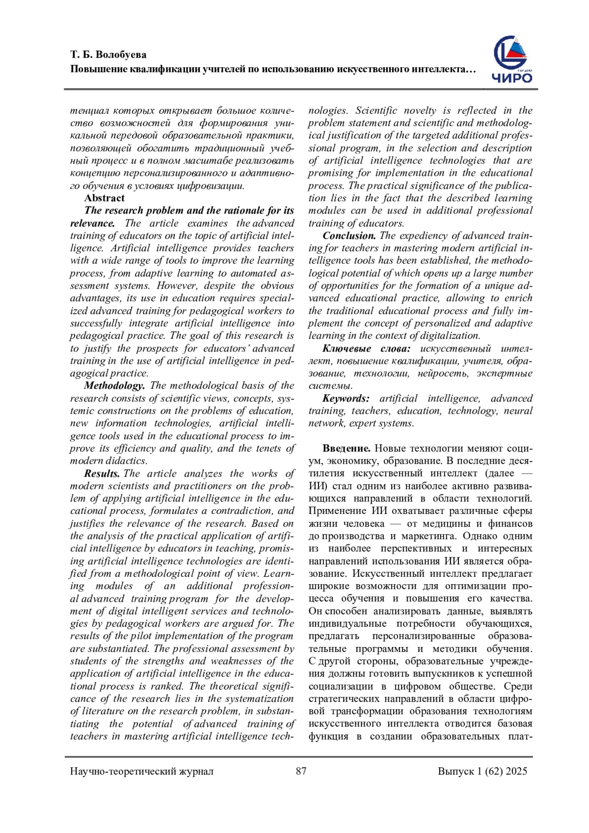 Проблема исследования и обоснование ее актуальности. В статье рассматривается повышение квалификации педагогов по проблеме искусственного интеллекта. Искусственный интеллект предоставляет учителям широкий спектр инструментов для улучшения учебного процесса, от адаптивного обучения до автоматизированных систем оценки. Однако, несмотря на очевидные преимущества, его использование в образовании требуют специального обучения педагогических работников для успешного интегрирования искусственного интеллекта в педагогическую практику. Цель данного исследования состоит в обосновании перспективности для педагогов повышения квалификации по использованию искусственного интеллекта в педагогической практике. Методология (материалы и методы). Методологической основой исследования послужили научные взгляды, концепции, системные построения по проблемам образования, новые информационные технологии, инструменты искусственного интеллекта, используемые в образовательном процессе с целью повышения его эффективности и качества, положения современной дидактики. Результаты. В статье анализируются труды современных ученых и практиков по проблеме применения искусственного интеллекта в образовательном процессе, формулируются противоречие и обосновывается актуальность исследования. На основе анализа практического применения искусственного интеллекта педагогами в обучении выделяются перспективные в методическом плане технологии искусственного интеллекта. Аргументируются учебные модули дополнительной профессиональной программы повышения квалификации по освоению педагогическими работниками цифровых интеллектуальных сервисов и технологий. Обосновываются результаты пилотной реализации программы. Ранжируется профессиональное оценивание слушателями сильных и слабых сторон применения искусственного интеллекта в образовательном процессе. Теоретическая значимость исследования состоит в систематизации литературы по проблеме исследования, в обосновании потенциала повышения квалификации учителей по освоению технологий искусственного интеллекта. Научная новизна отражается в постановке проблемы и научно-методическом обосновании целевой дополнительной профессиональной программы, в отборе и описании перспективных для внедрения в образовательный процесс технологий искусственного интеллекта. Практическая значимость публикации состоит в том, что описанные учебные модули могут применяться в дополнительном профессиональном обучении педагогов. Заключение. Установлена целесообразность повышения квалификации учителей по освоению современных инструментов искусственного интеллекта, методический потенциал которых открывает большое количество возможностей для формирования уникальной передовой образовательной практики, позволяющей обогатить традиционный учебный процесс и в полном масштабе реализовать концепцию персонализированного и адаптивного обучения в условиях цифровизации.