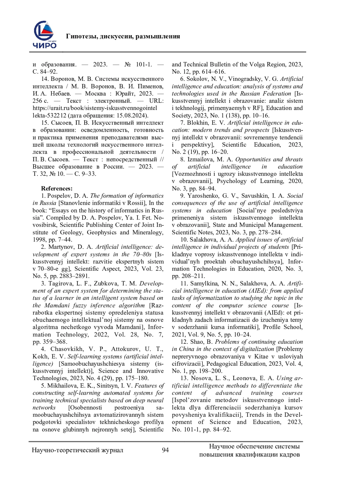 6. Соколов, Н. В. Искусственный интеллект и образование: анализ систем и технологий, применяемых в РФ / Н. В. Соколов, В. Г. Виноградский. - Текст: непосредственный // Образование и общество. - 2023. - № 1 (138). - С. 10-16. EDN: QRDOGA