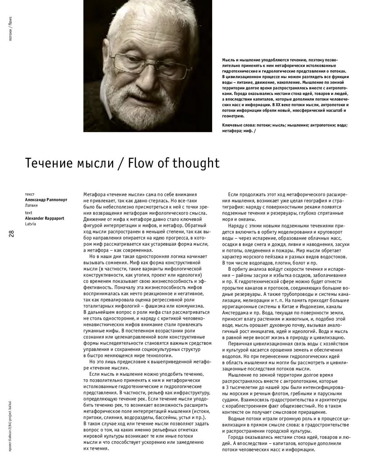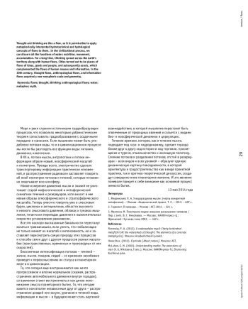 Мысль и мышление уподобляются течению, поэтому позволительно применять к ним метафорически истолкованные гидротехнические и гидрологические представления о потоках. В цивилизационном процессе мы можем разглядеть все функции воды - питание, движение, накопление. Мышление по земной территории долгое время распространялось вместе с антропотоками. Города оказывались местами стока идей, товаров и людей, а впоследствии капиталов, которые дополнили потоки человеческих масс и информации. В XX веке потоки мысли, антропотоки и потоки информации обрели новый, ноосферический масштаб и геометрию.