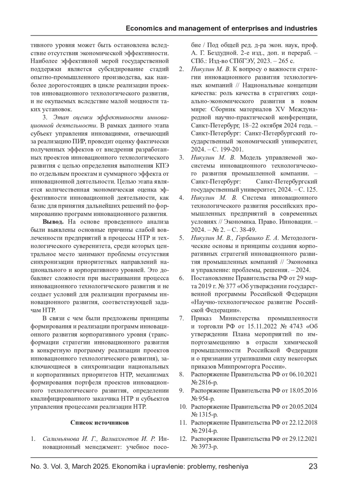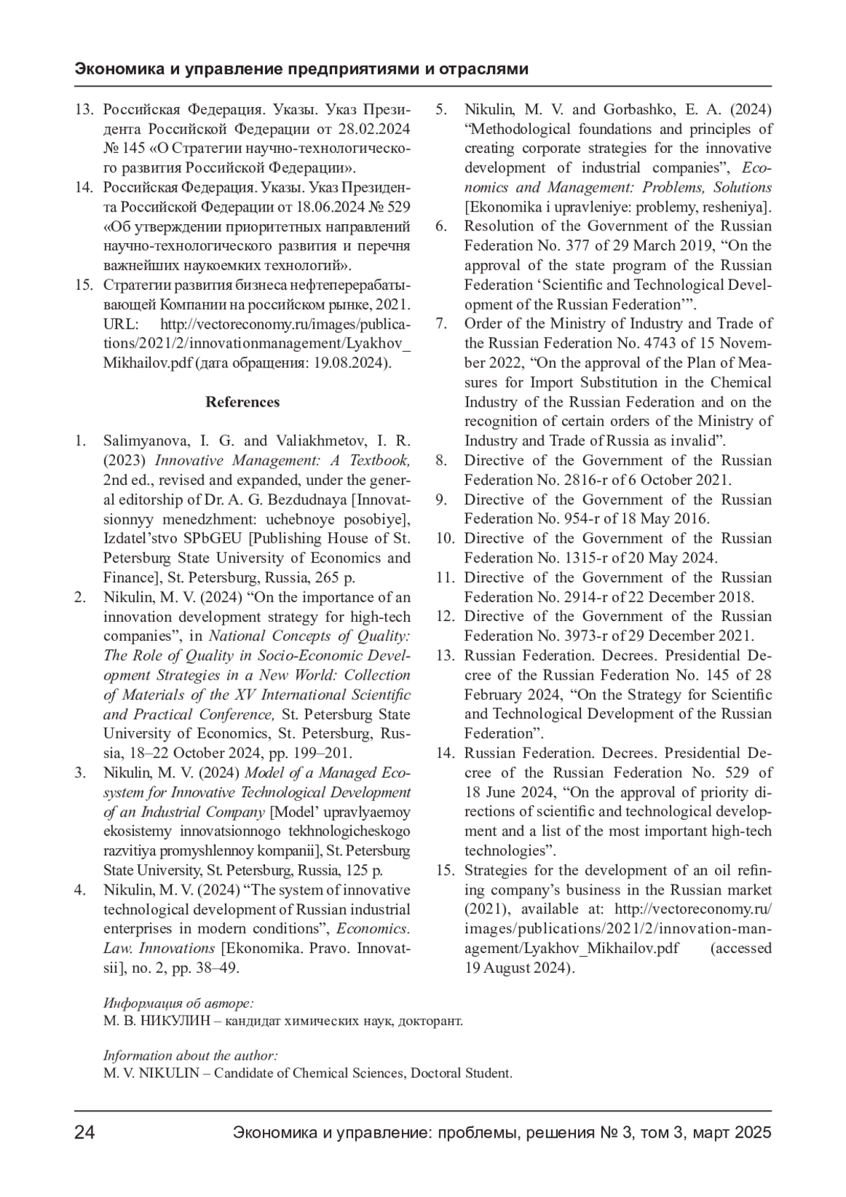 5. Никулин М. В., Горбашко Е. А. Методологические основы и принципы создания корпоративных стратегий инновационного развития промышленных компаний // Экономика и управление: проблемы, решения. - 2024. EDN: WXPLXY