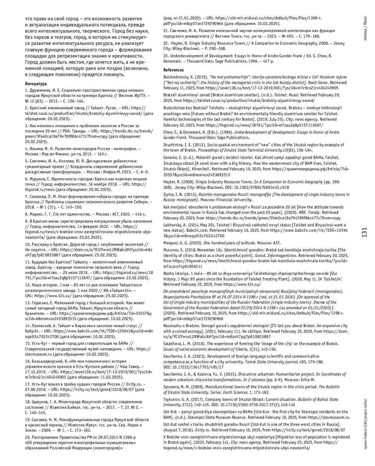 7. Салахова, Л. М. Опыт формирования “образа города” на примере Братска // Проблемы социально-экономического развития Сибири. - 2018. - № 1 (31). - С. 145-150. EDN: YWZSXE
