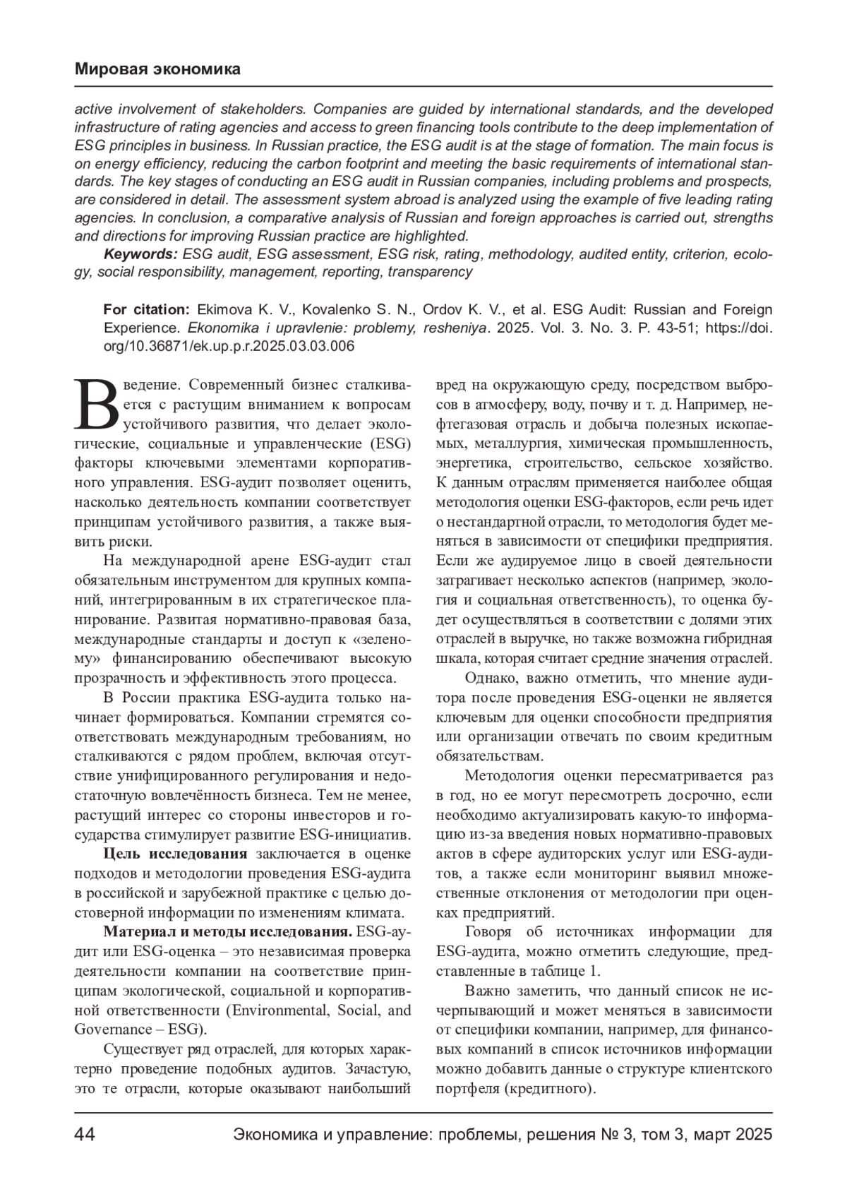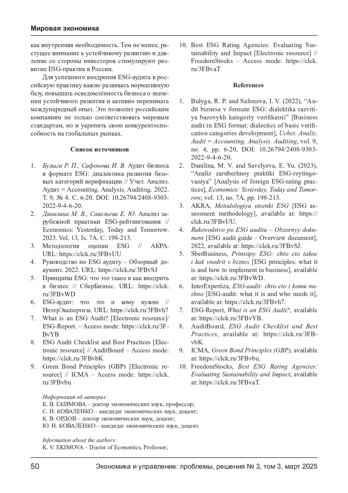 ЕКИМОВА К. В., КОВАЛЕНКО С. Н., ОРДОВ К. В., КОВАЛЕНКО Ю. Н. ESG-АУДИТ: РОССИЙСКИЙ И ЗАРУБЕЖНЫЙ ОПЫТ // ЭКОНОМИКА И УПРАВЛЕНИЕ: ПРОБЛЕМЫ, РЕШЕНИЯ. 2025. ТОМ 3 № 3