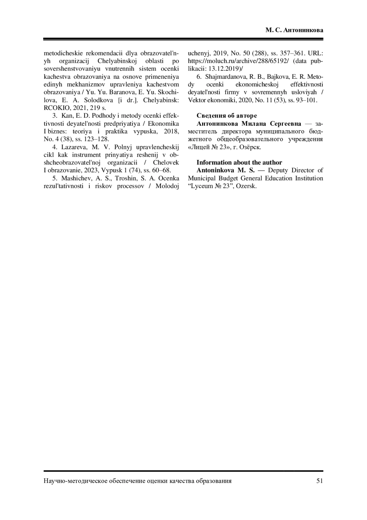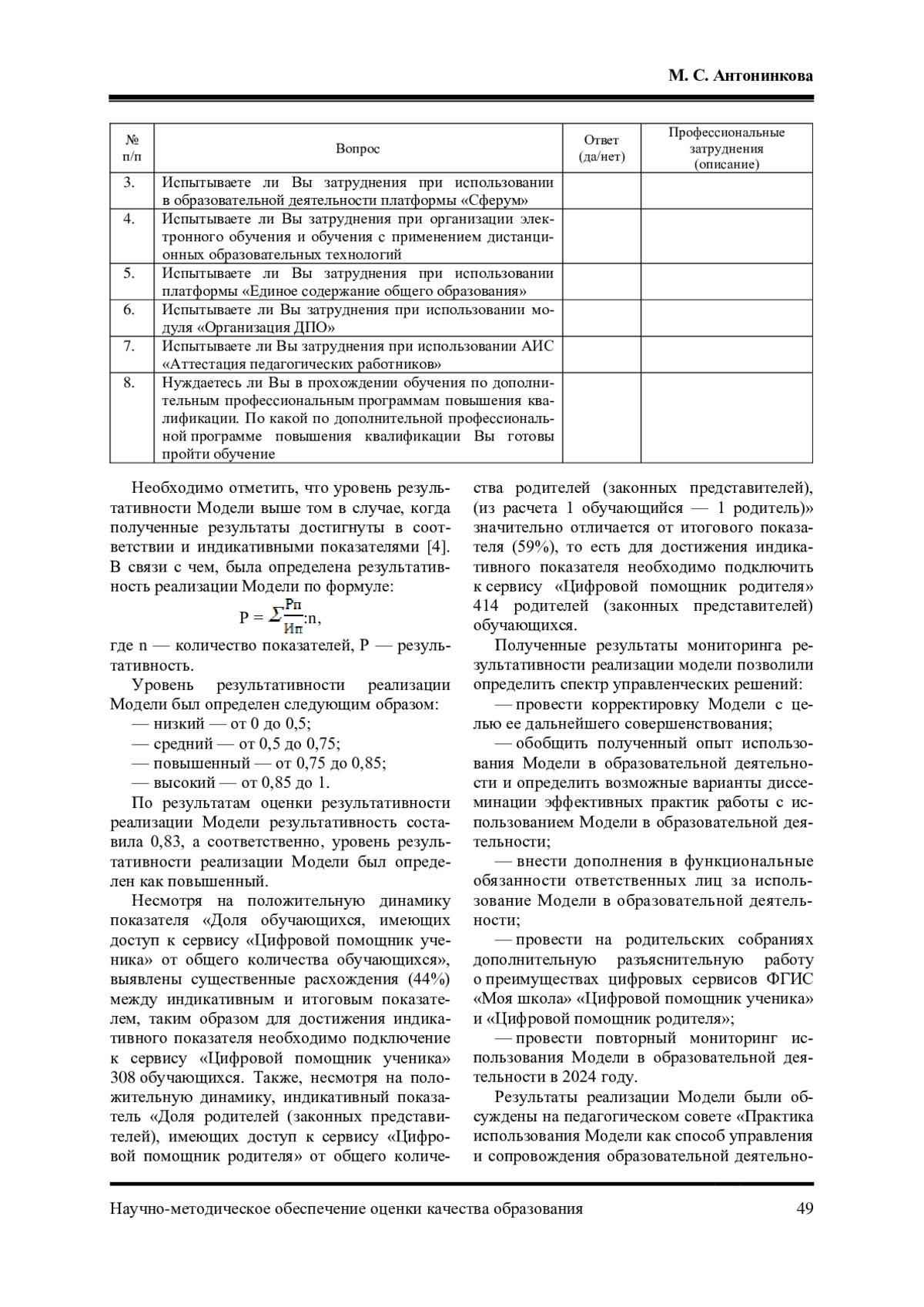 АНТОНИНКОВА М. С. ОЦЕНКА ЭФФЕКТИВНОСТИ РЕАЛИЗАЦИИ МОДЕЛИ ЦИФРОВОЙ ЭКОСИСТЕМЫ ЛИЦЕЯ // НАУЧНО-МЕТОДИЧЕСКОЕ ОБЕСПЕЧЕНИЕ ОЦЕНКИ КАЧЕСТВА ОБРАЗОВАНИЯ. 2024. № 1 (19)