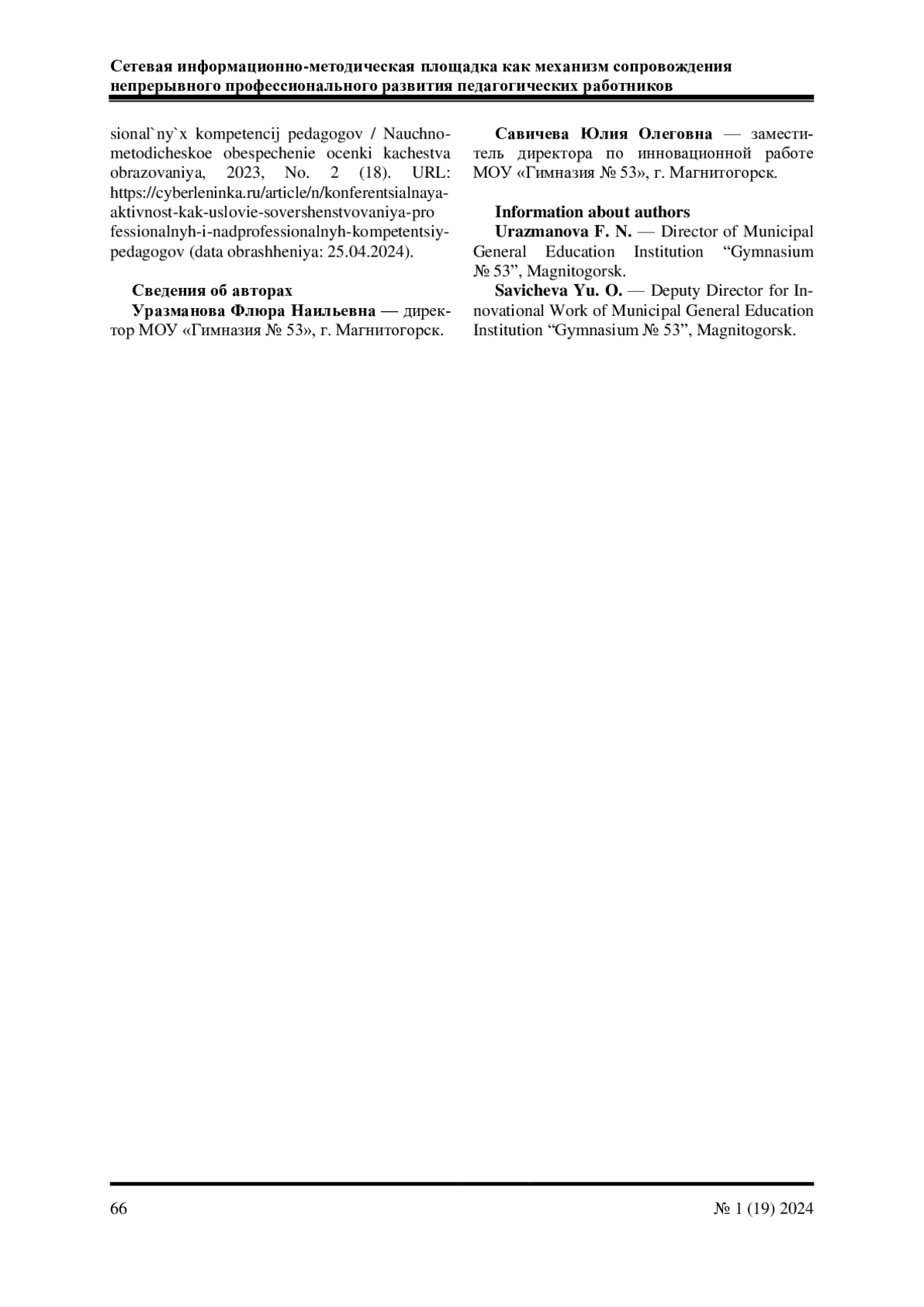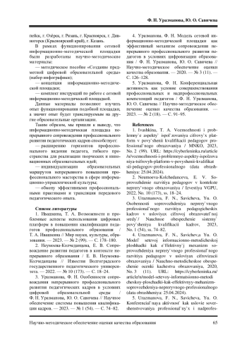 3. Уразманова, Ф. Н. Особенности сопровождения непрерывного профессионального развития педагогических кадров в условиях цифровой образовательной среды / Ф. Н. Уразманова, Ю. О. Савичева // Научное обеспечение системы повышения квалификации кадров. - 2023. - № 1 (54). - С. 74-82. EDN: WLJMNE