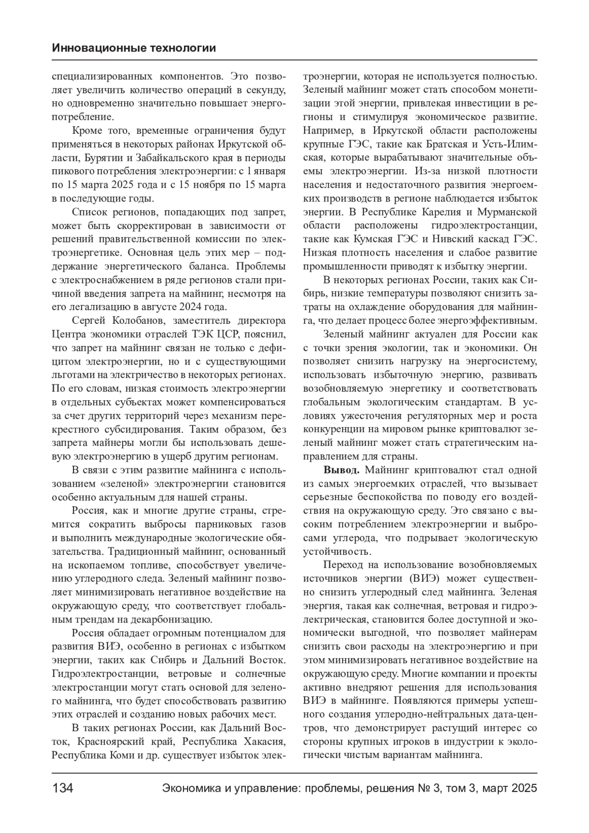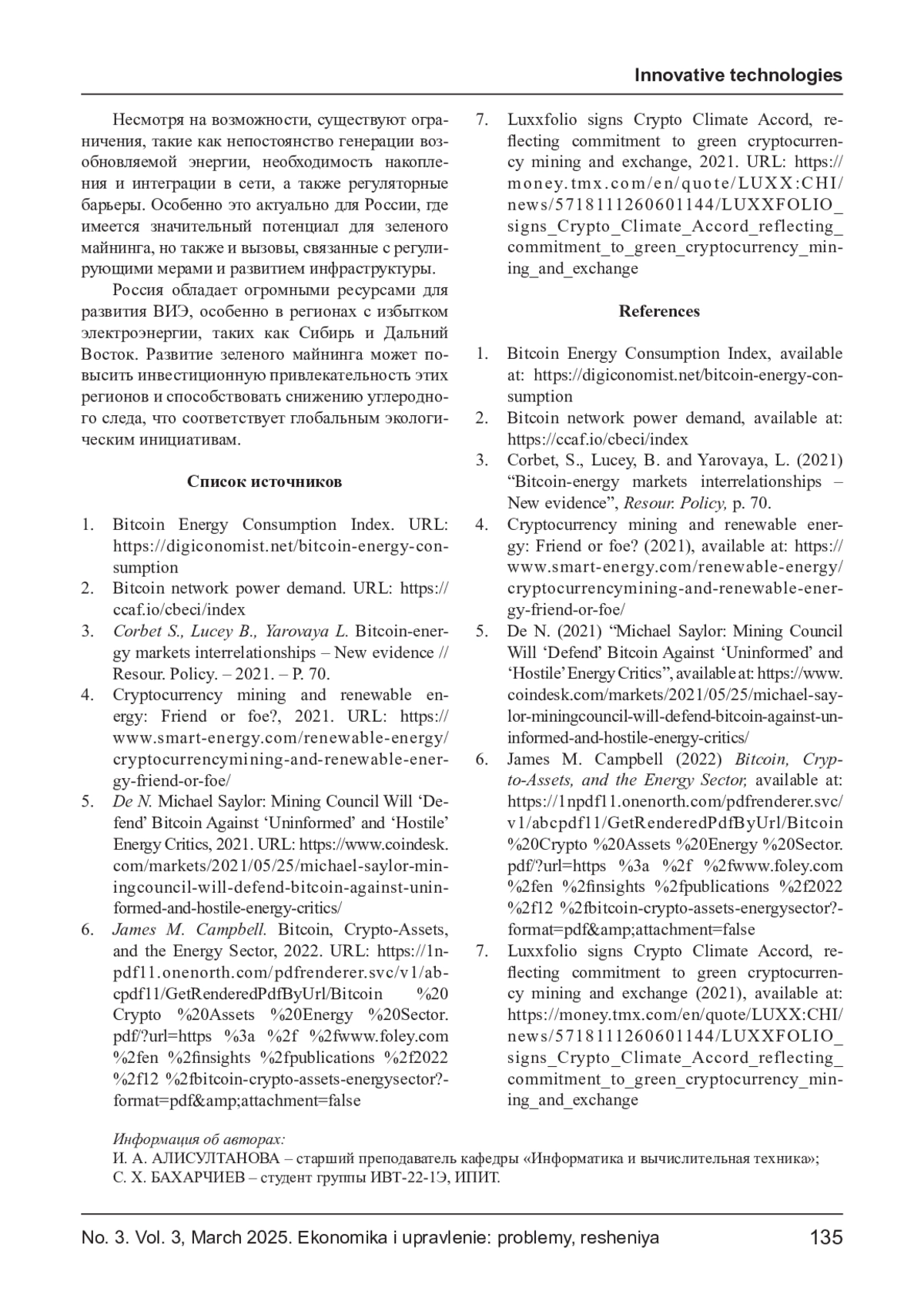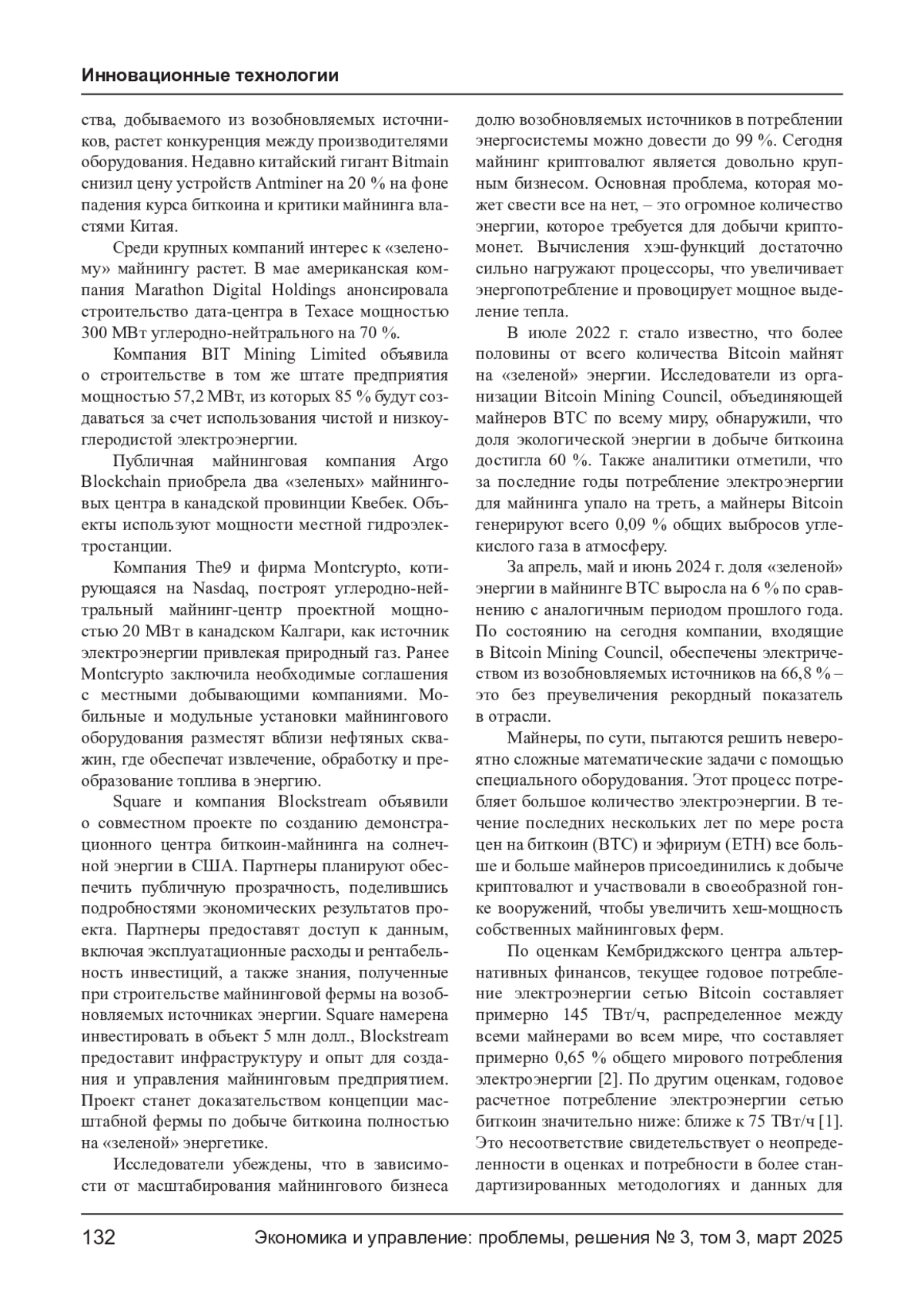 АЛИСУЛТАНОВА И. А., БАХАРЧИЕВ С. Х. МАЙНИНГ КРИПТОВАЛЮТЫ С ИСПОЛЬЗОВАНИЕМ «ЗЕЛЕНОЙ» ЭЛЕКТРОЭНЕРГИИ // ЭКОНОМИКА И УПРАВЛЕНИЕ: ПРОБЛЕМЫ, РЕШЕНИЯ. 2025. ТОМ 3 № 3